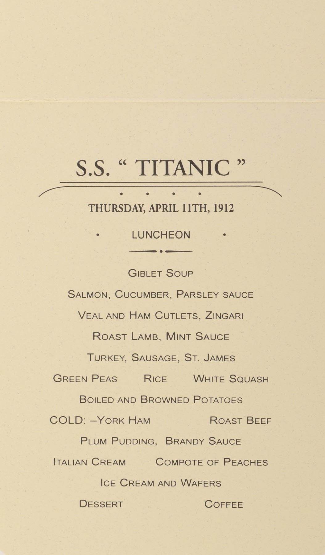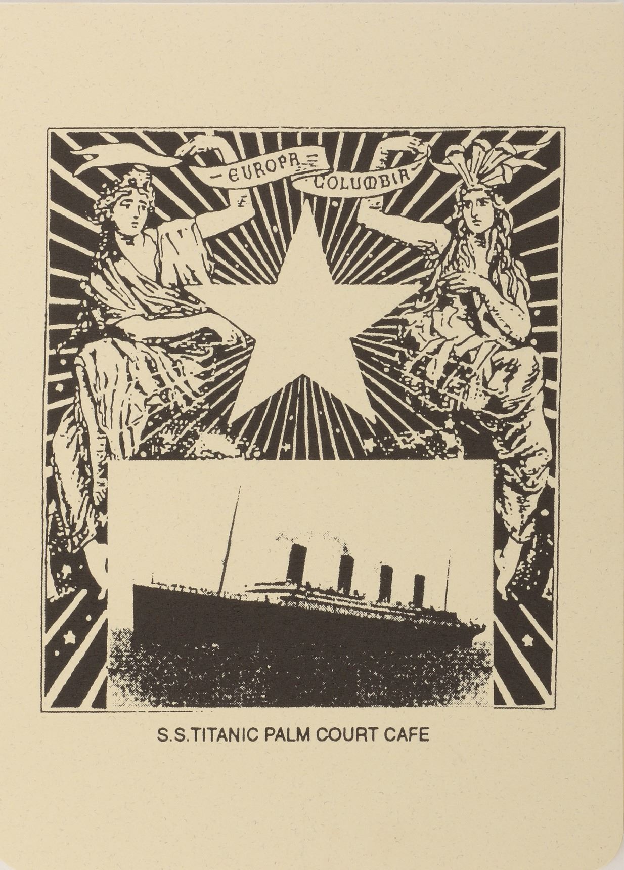 341. Titanic menu & silver star menu holder. (TCF, 1997) Original (1) paper 5.5 x 4 in. folded menu card with printed image of the Titanic on the front and interior menu items, and (1) 2 x 2.5 in. pewter star and base menu card stand. In very good to fine condition. $200 - $300