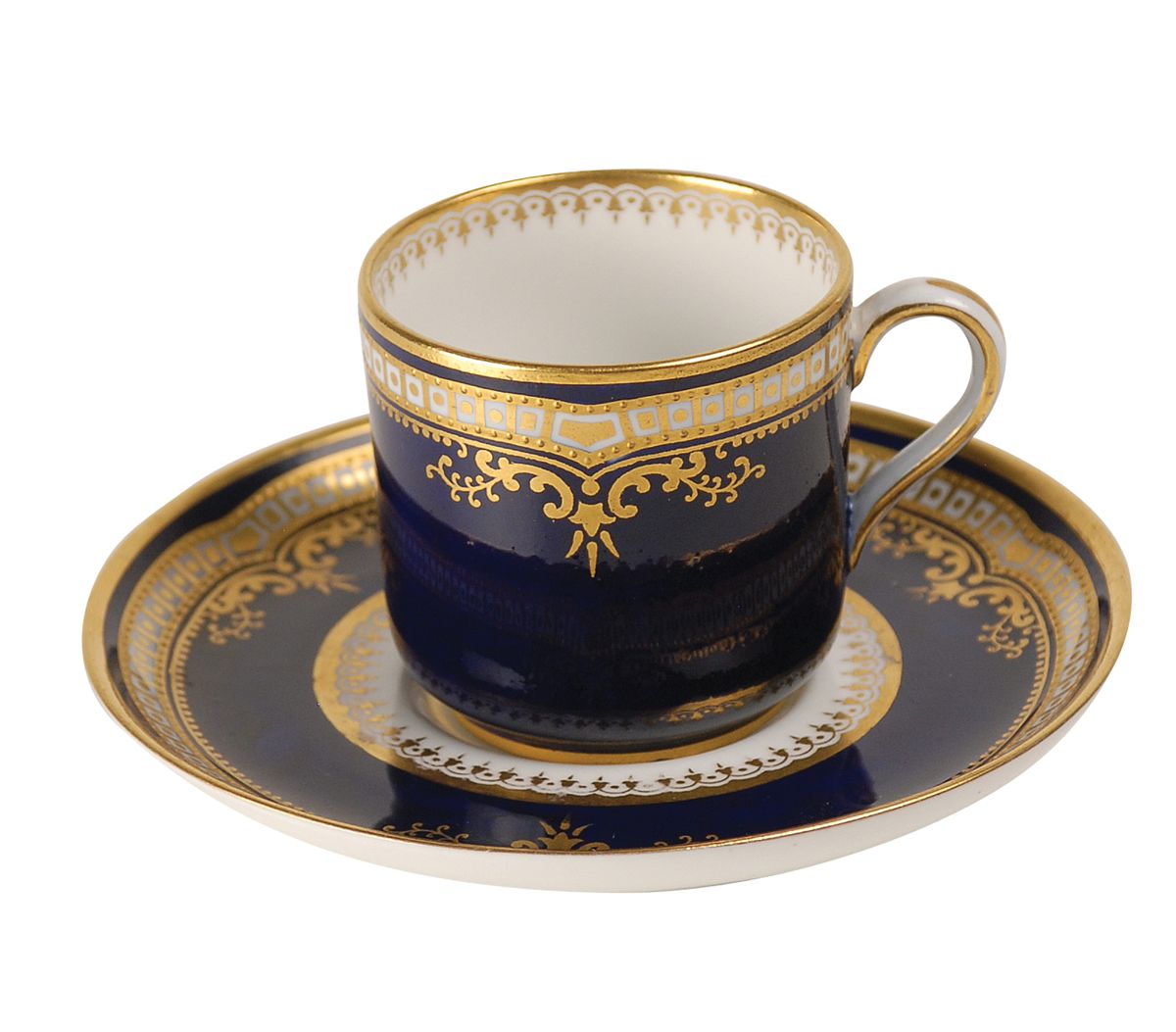 A stunning cobalt blue demitasse cup and saucer designated for the Titanic. This is an extremely rare set believed to have been destined for the first class a la carte restaurant on-board Titanic. Both the bottom of the saucer is labeled “Stonier & Co. Liverpool, Spode Copeland’s China, England, R4332, Rd No. 580303, White Star Line, ” and bottom of cup is labeled “Rd No. 580303, Spode Copeland’s China, England, White Star Line.”