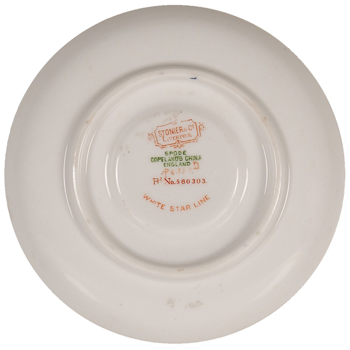 Additional References: p.31 Titanic: Touchstones of a Tragedy by Steve Santini (Writers Club Press 2000); p.54 Titanic: An Illustrated History by Don Lynch and Ken Marschall (Hyperion 1992); http://www.encyclopedia-titanica.org/cup-saucer-from-titanic.html; http://marconigraph.com/titanic/china/mgy_china.html