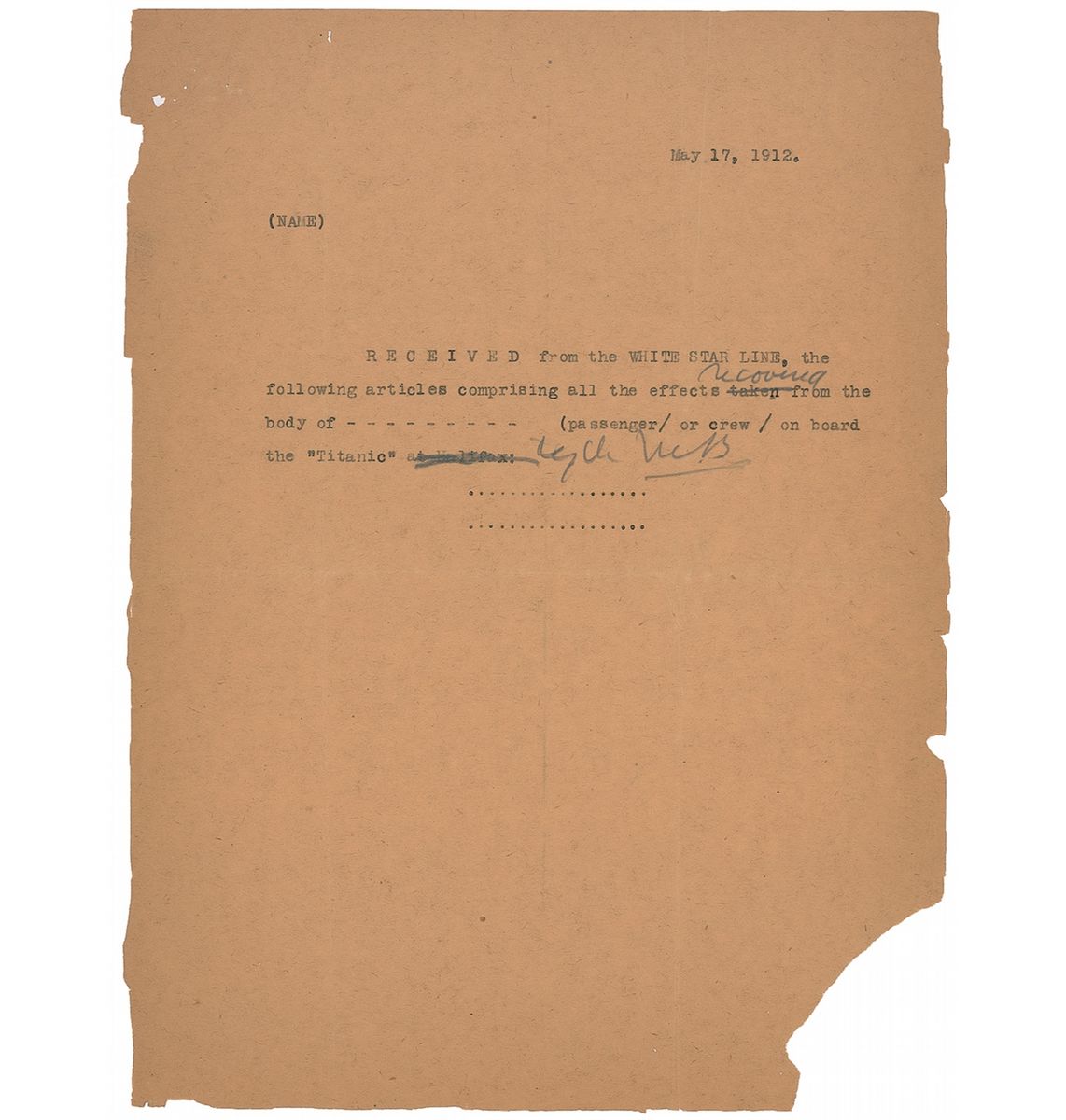 Extremely rare typed sample letter, one page, 8 x 10.75, dated May 17, 1912 from the White Star Line, being a form letter that White Star was to present to family members of victims in order to obtain their signature confirming receipt of the victim’s personal effects which were to be listed in the letter below. Printed portion of the text reads, “Received from the White Star Line, the following articles comprising all the effects recovered from the body of…(passenger/ or crew/ on board the ‘Titanic.’”Letter has a couple of pencil corrections and notations. Paper loss to edges and lower right corner, staple holes to top left, and a uniform shade of moderate toning, otherwise very good condition. A very uncommon offering showing the inner workings of the White Star’s recovery efforts.