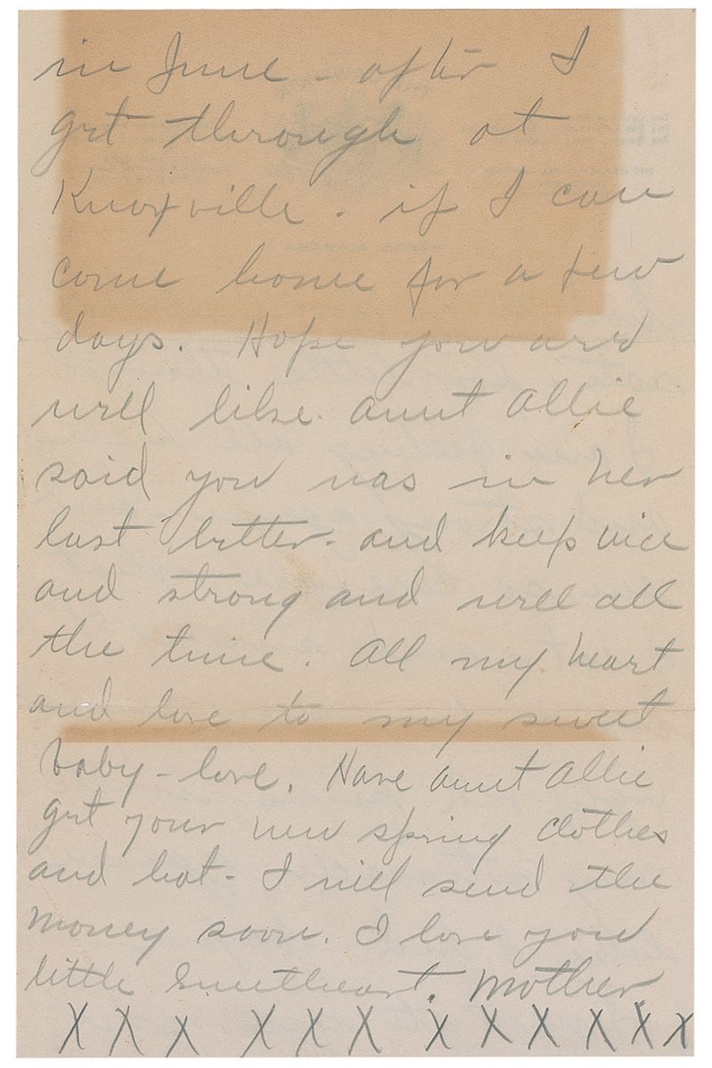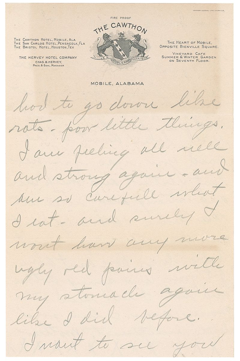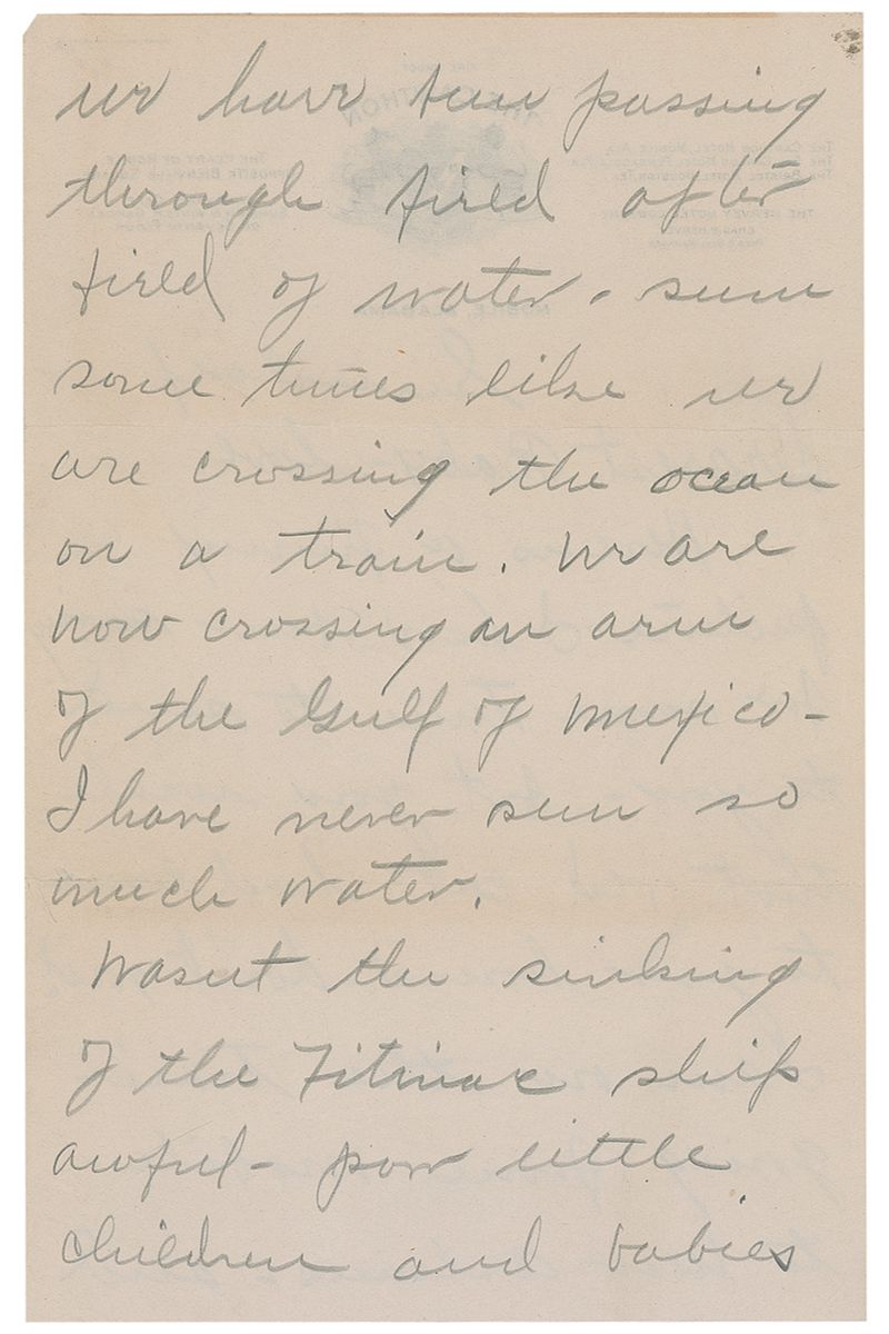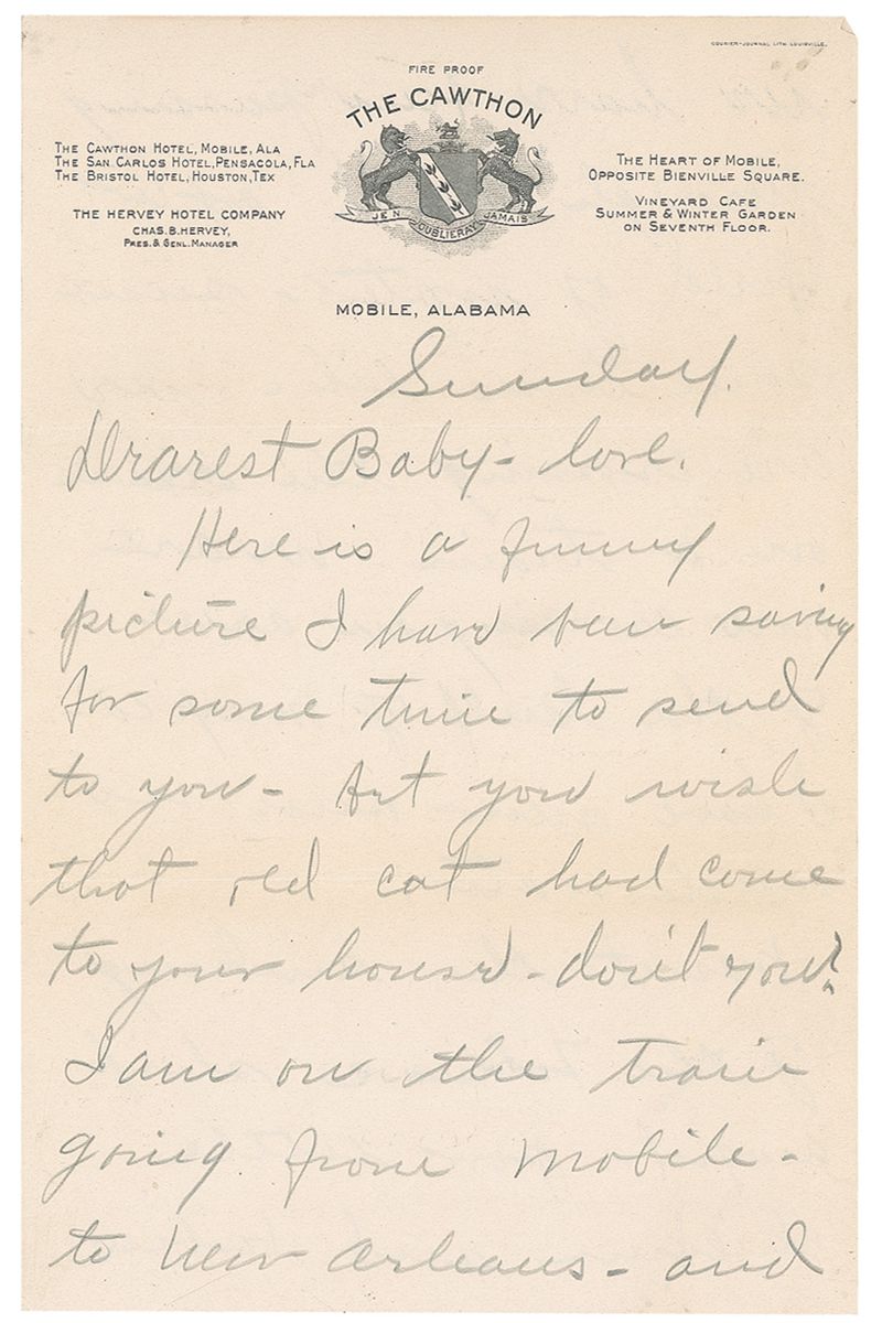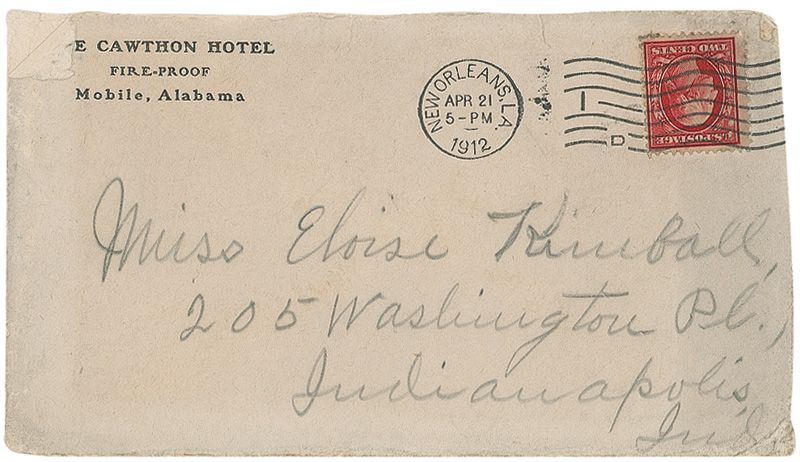 ALS, in pencil, signed “Mother,” two pages both sides, 6 x 9.25, The Cawthon letterhead, no date, but postmarked April 21, 1912. Letter from a mother to her daughter mentioning the sinking of the Titanic. In part: “Wasn’t the sinking of the Titanic ship awful—poor little children and babies had to go down like rats—poor little things.” In very good condition, with scattered blocks of toning. Accompanied by the original mailing envelope.