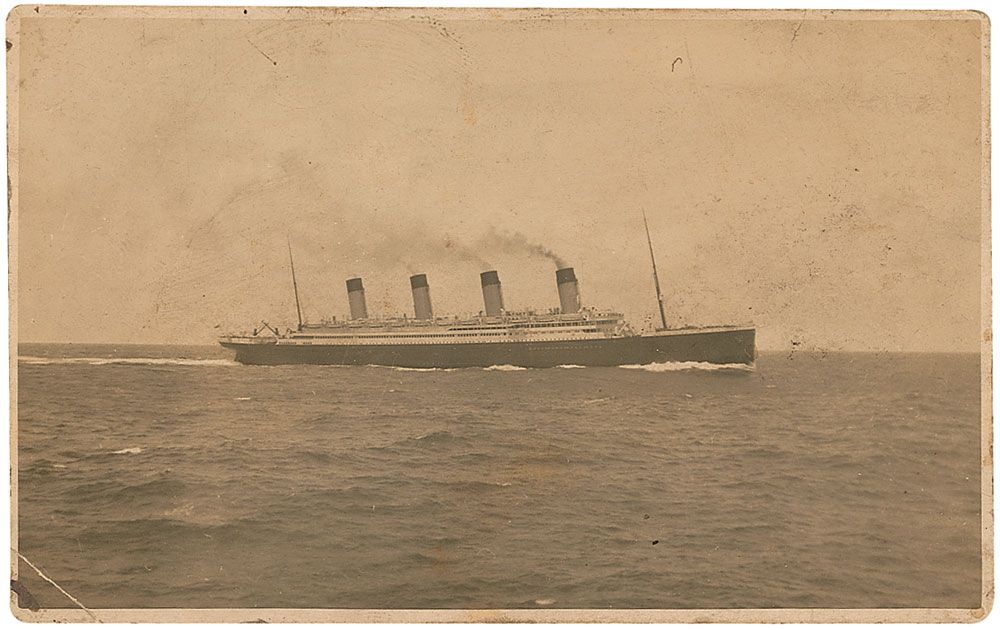 Unused French real photo postcard of the majestic White Star Line steamer in the open ocean. In very good condition, with scattered creases, toning, and soiling.