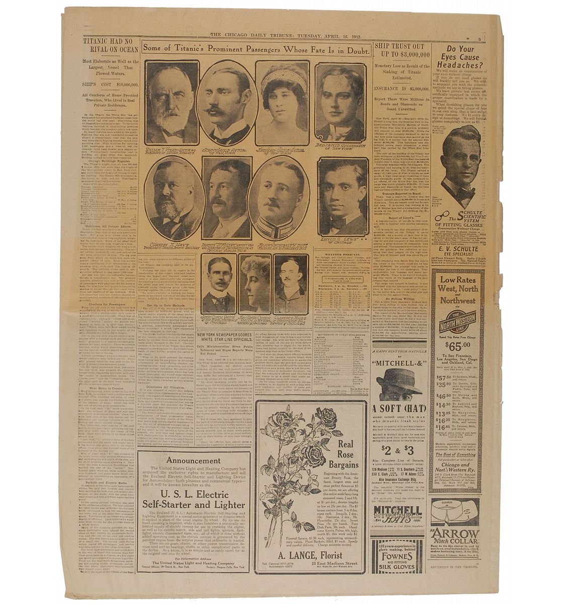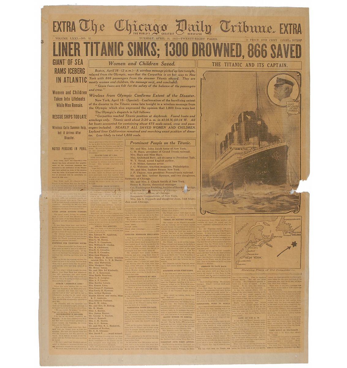 Incredibly rare original complete April 16, 1912, “Extra” edition of the Chicago Daily Tribune, 16.5 x 23, with the headline reading “Liner Titanic Sinks; 1300 Drowned, 866 Saved,” with one of the lead story’s headline reading “Giant of Sea Rams Iceberg in Atlantic; Women and Children Taken into Lifeboats While Men Remain." Upper portion of the page has a photograph of the Titanic and Captain Smith, as well as a list of prominent passengers. In very good condition, with some small separations and paper loss along the expected central horizontal fold, tape remnants along reverse top edge of front page, uniform toning, and some small tears and chips to edges.