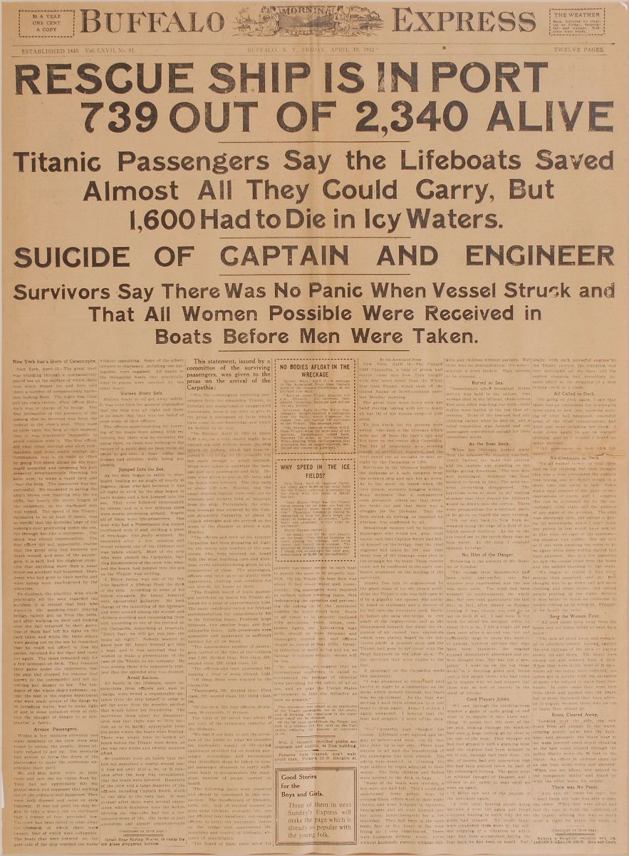 Front page of the Buffalo Express newspaper from April 19, 1912, one page, 16 x 21.75, reporting the estimated death toll and status of survivors from the Titanic sinking, which occurred just five days prior. The headline and subhead read, “Rescue Ship Is In Port, 739 Out Of 2,340 Alive, Titanic Passengers Say the Lifeboats Saved Almost All They Could Carry, But 1,600 Had to Die in Icy Waters, Suicide of Captain and Engineer, Survivors Say There Was No Panic When Vessel Struck and That All Women Possible Were Received in Boats Before Men Were Taken.” Matted to an overall size of 23 x 30. In fine condition, with central vertical and horizontal folds, expected uniform toning, and some wear to edges.
