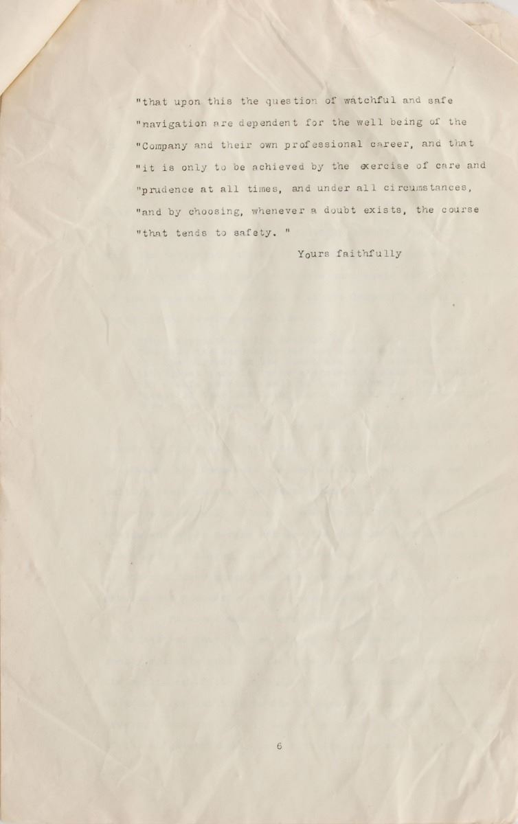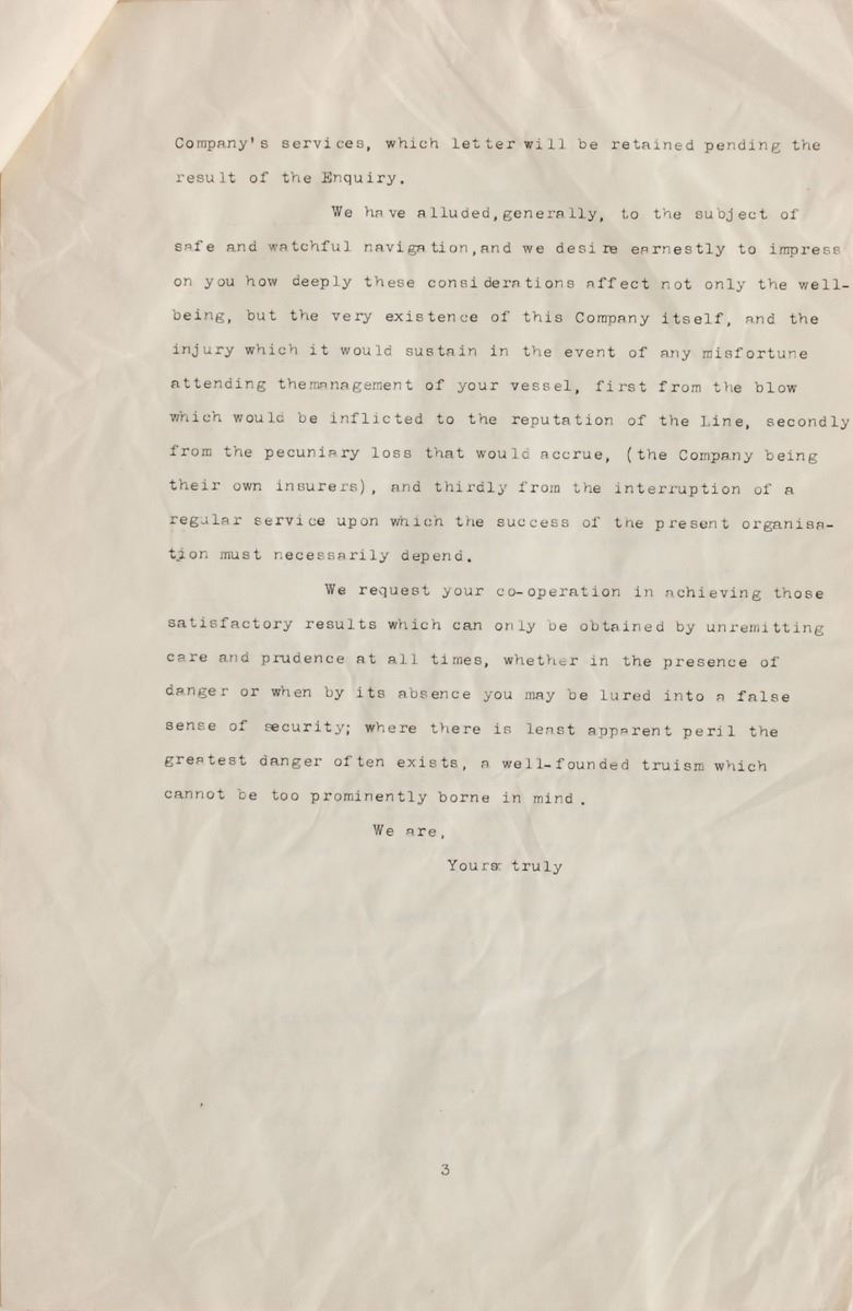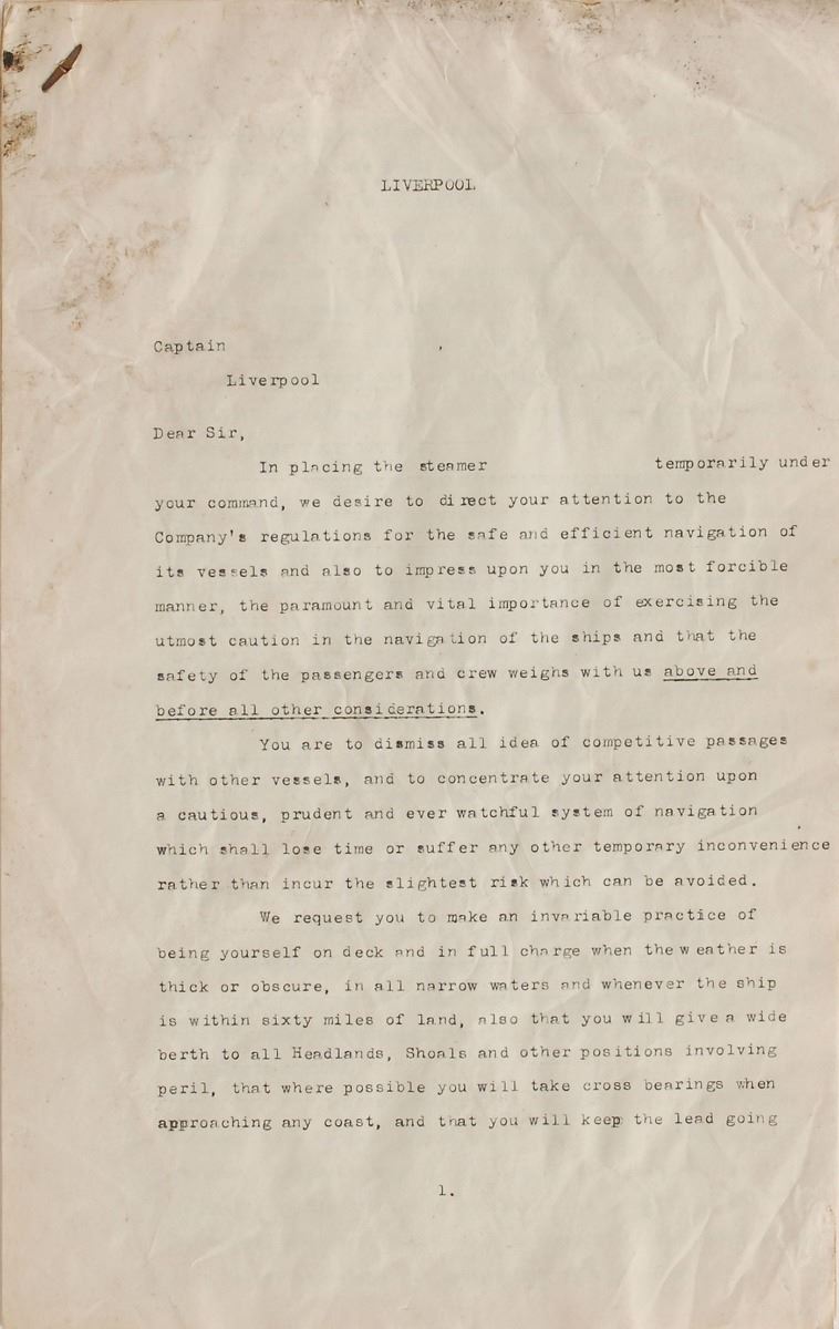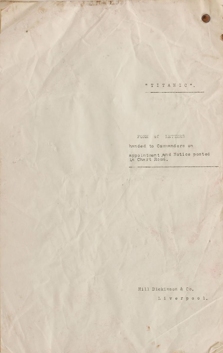 Typed document issued by the White Star Line’s law firm Hill Dickinson & Co., eight pages, 8 x 12.75, no date but circa 1912–1920. Packet of three official letters identified on the reverse as “‘Titanic.’ Form of Letters handed to Commanders on appointment and Notice posted in Chart Room.” The letters emphasize the importance of safety and outline the duties of the ship’s captain. In part: “In placing the steamer _____ temporarily under your command, we desire to direct your attention to the Company’s regulations for the safe and efficient navigation of its vessels and also to impress upon you in the most forcible manner, the paramount and vital importance of exercising the utmost caution in the navigation of the ships and that the safety of the passengers and crew weighs with us above and before all other considerations.” In very good condition, with some soiling (primarily to the first page), and moderately heavy overall wrinkling and creasing. These standard instructions issued to the captains of White Star Line ships were one of the subjects of the British Wreck Commissioner's Inquiry; when the letters were initially drafted and issued the company acted as its own insurer, and they do go on to emphasize the grave financial costs of losing a ship. Although they were partially insured by the time of the Titanic disaster, it took several years before any passengers or families of the deceased received compensation.