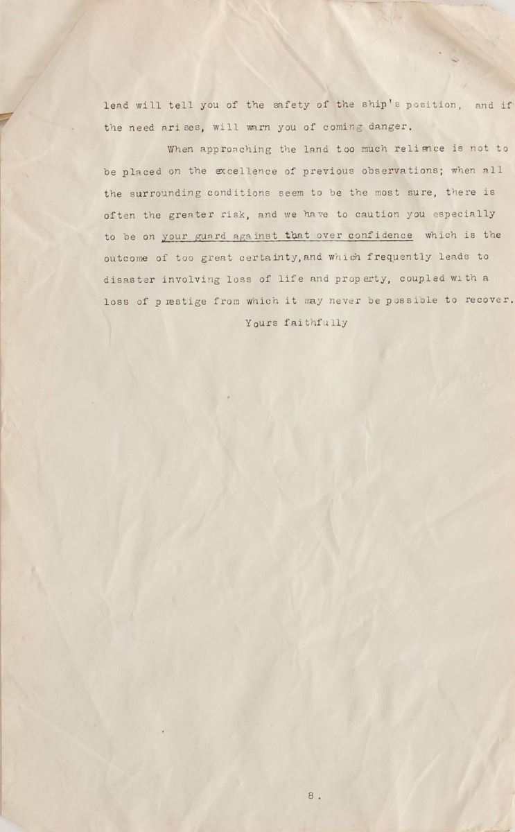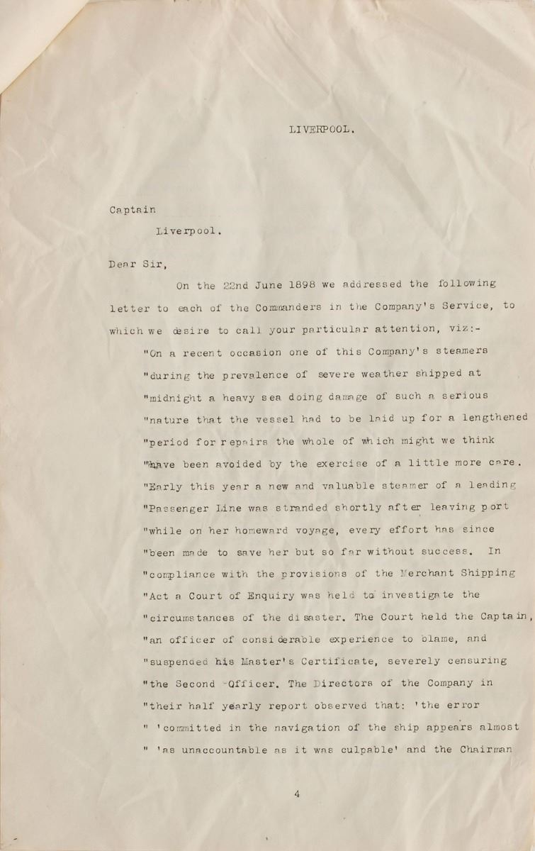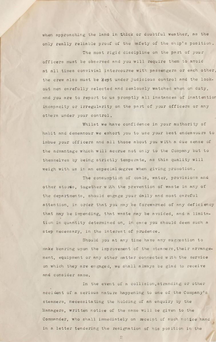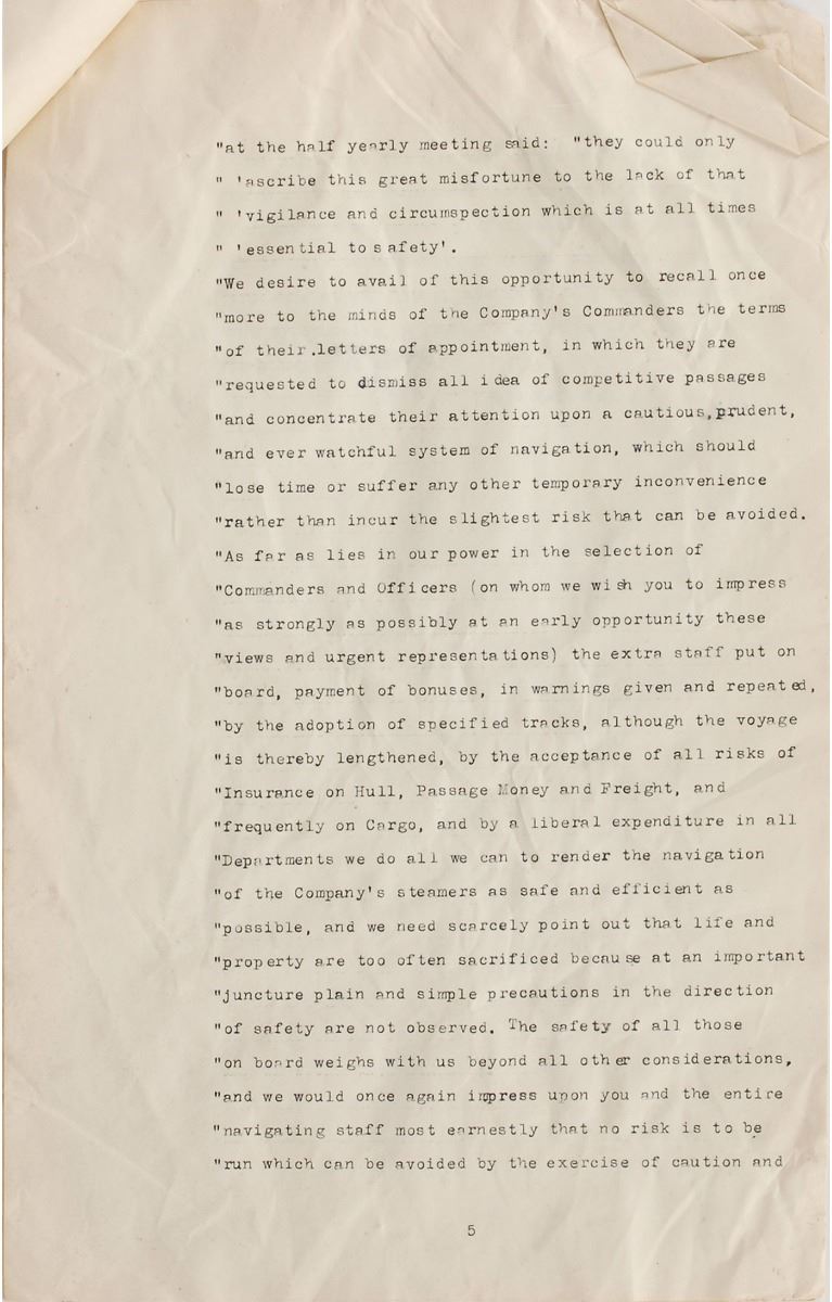 Typed document issued by the White Star Line’s law firm Hill Dickinson & Co., eight pages, 8 x 12.75, no date but circa 1912–1920. Packet of three official letters identified on the reverse as “‘Titanic.’ Form of Letters handed to Commanders on appointment and Notice posted in Chart Room.” The letters emphasize the importance of safety and outline the duties of the ship’s captain. In part: “In placing the steamer _____ temporarily under your command, we desire to direct your attention to the Company’s regulations for the safe and efficient navigation of its vessels and also to impress upon you in the most forcible manner, the paramount and vital importance of exercising the utmost caution in the navigation of the ships and that the safety of the passengers and crew weighs with us above and before all other considerations.” In very good condition, with some soiling (primarily to the first page), and moderately heavy overall wrinkling and creasing. These standard instructions issued to the captains of White Star Line ships were one of the subjects of the British Wreck Commissioner's Inquiry; when the letters were initially drafted and issued the company acted as its own insurer, and they do go on to emphasize the grave financial costs of losing a ship. Although they were partially insured by the time of the Titanic disaster, it took several years before any passengers or families of the deceased received compensation.