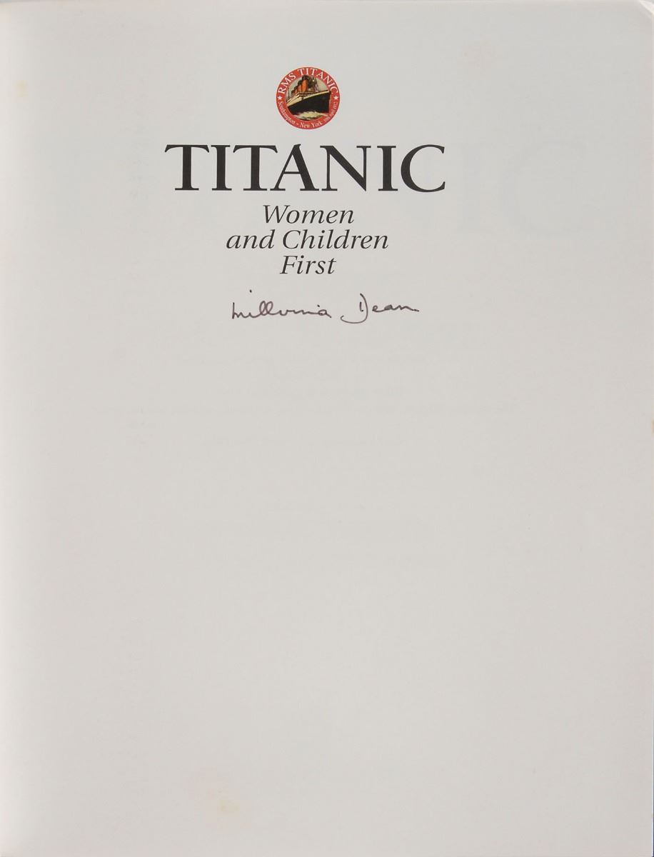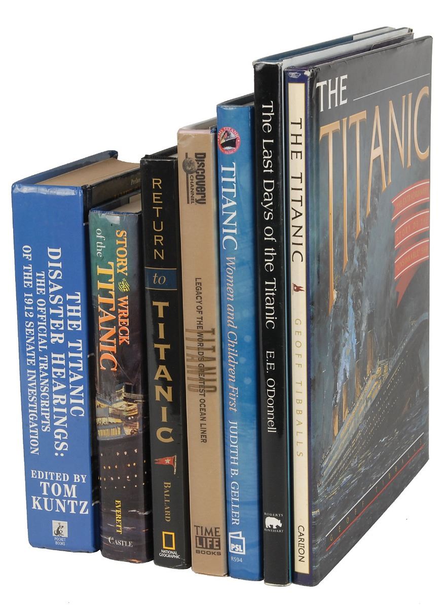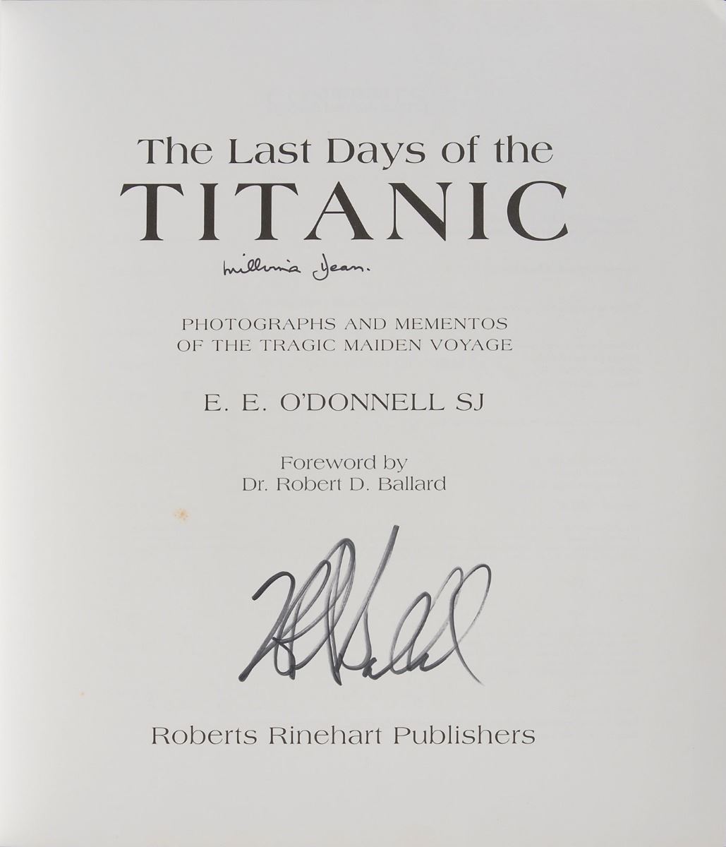 Collection of seven hardcover books, each signed inside by a figure associated with the Titanic, including: Millvina Dean (5); Millvina Dean and Robert Ballard; and Robert Ballard. In overall very good to fine condition.