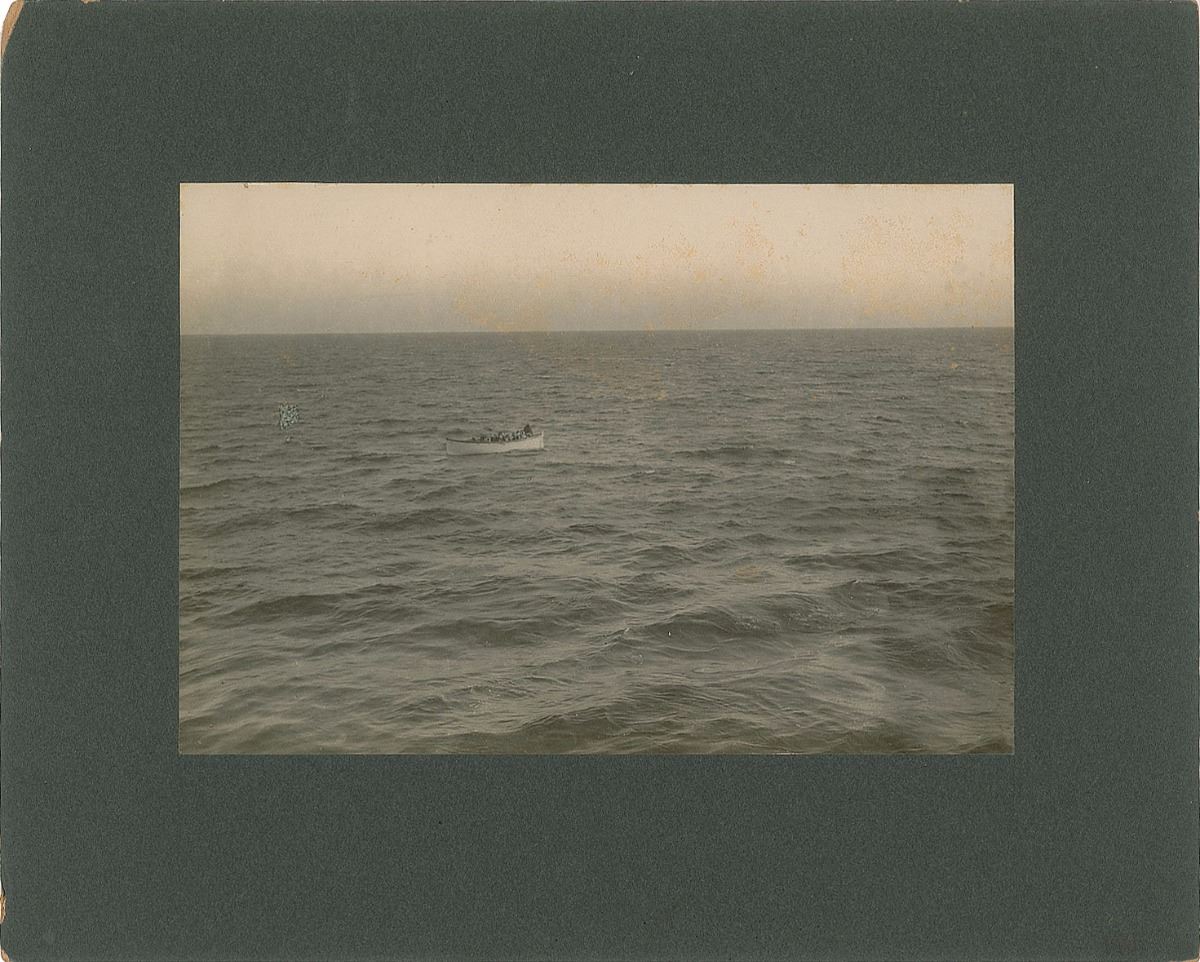Original mounted matte-finish 7 x 4.75 photograph of Titanic emergency lifeboat No. 1, affixed to its original 10 x 8 photographic mount. The photograph, taken by Carpathia passenger Louis M. Ogden on the morning of April 15, depicts the emergecy boat floating in the North Atlantic Ocean. In fine condition, with a tiny piece missing from the lower left corner tip of the mount.Ogden was a New York socialite aboard the RMS Carpathia during the Titanic disaster who helped to photograph, document, and assist the survivors. This was among the thirty images he captured that day.