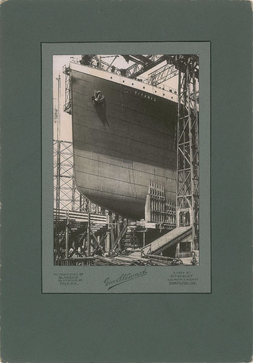 Fantastic 4 x 5.75 cabinet photo of the Titanic under construction at the Harland and Wolff Shipyard in Belfast, Ireland, from circa 1911. Affixed to its original 7 x 10 Geo. Stewart studio mount. The ship’s name prominently appears on the port side of the upper hull. In fine condition, with very light edge wear. A very uncommon original pre-sinking photograph.