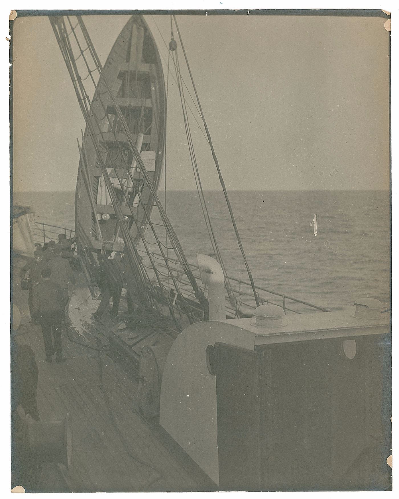 Original first-generation matte-finish 10.75 x 13.75 lightweight photo of Titanic Emergency Lifeboat 2, the first to reach the Carpathia, being hoisted aboard the rescue vessel. The photograph, taken by Carpathia passenger Louis M. Ogden on the morning of April 15, shows a close perspective of the empty lifeboat suspended from ropes as several men ease it to the deck. In very good to fine condition, with some minor chipping along the edges. Ogden was a New York socialite aboard the RMS Carpathia during the Titanic disaster who helped to photograph, document, and assist the survivors. Among the thirty images he captured that day, this example was loaned by Ogden to Titanic survivor Archibald Gracie, a passenger on Lifeboat 12, who had the photo enlarged to use while writing his book The Truth About the Titanic, which was published posthumously in 1913.