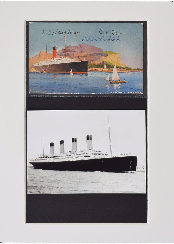 Attractive color postcard 5.5 x 3.5 showing an artistic depiction of the RMS Carpathia off the coast of Palermo, Italy, signed on the front in black ballpoint by Edith E. Haisman and Bertram Vere Dean, and in blue ballpoint by Beatrice Sandström. Matted with an image of the Titanic to an overall size of 8.25 x 11.5. In fine condition.