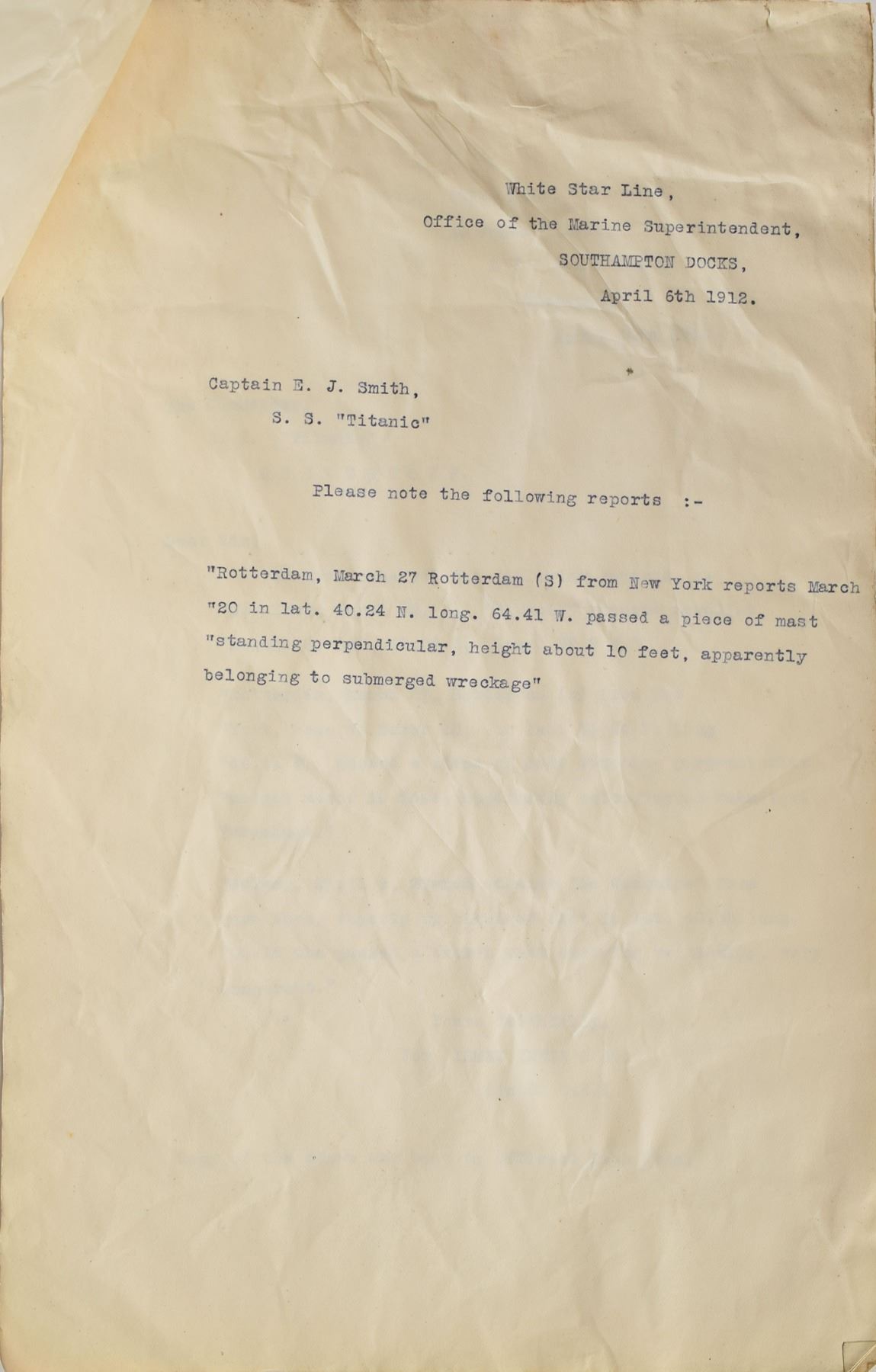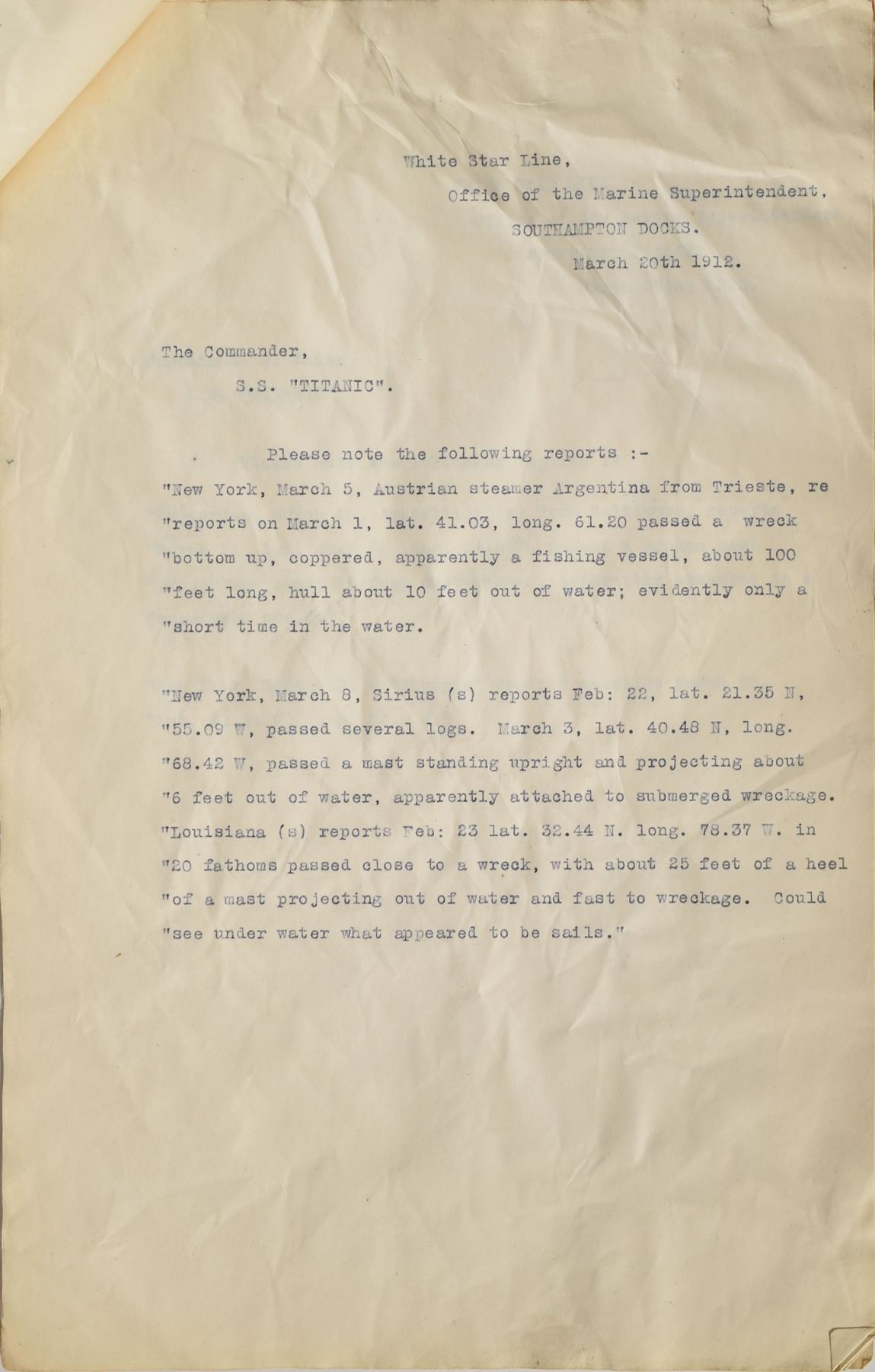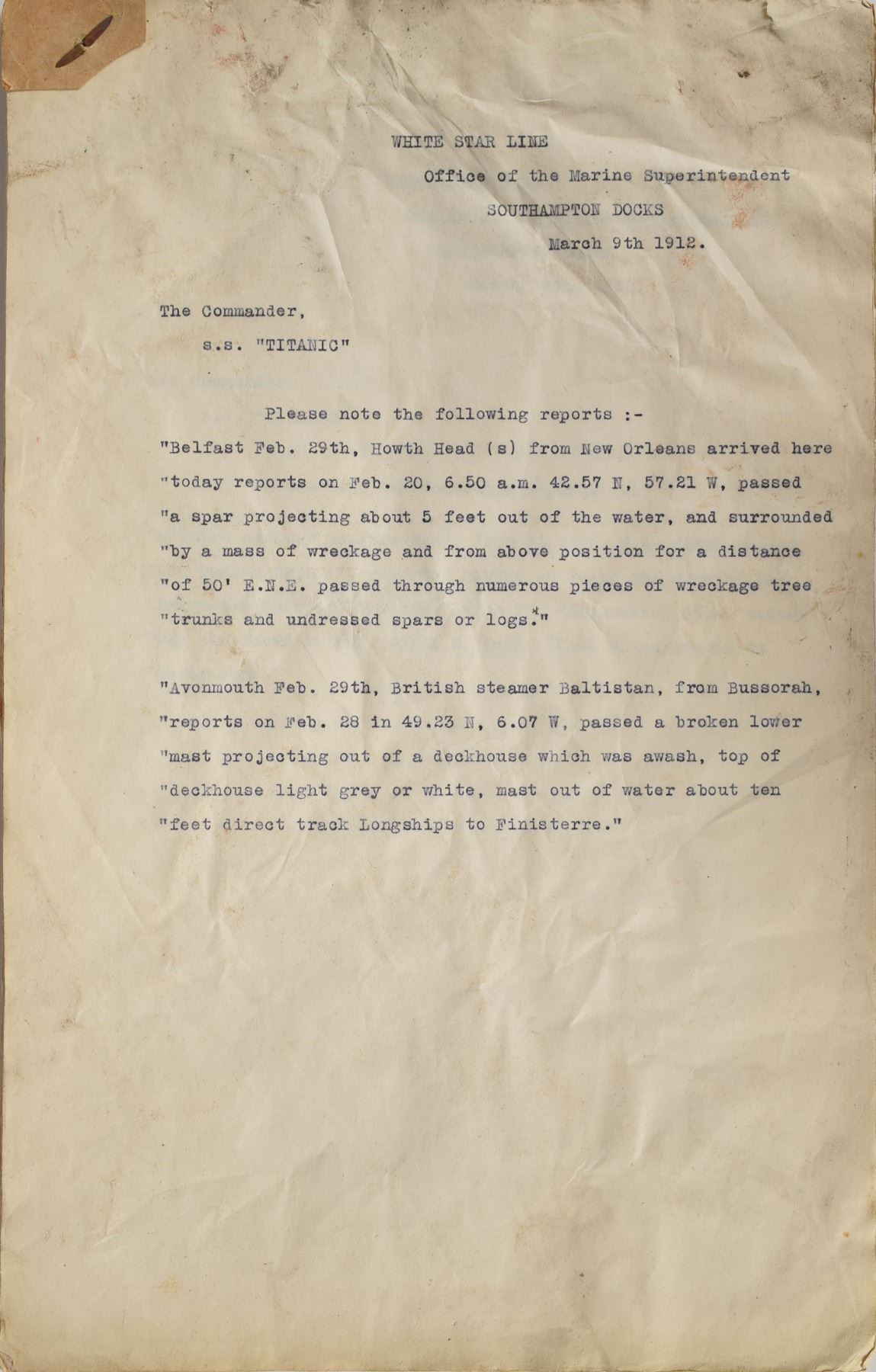The first, dated March 9, 1912, addressed to "The Commander, s.s. 'Titanic,'" in part: “'Belfast Feb. 29th. Howth Head (s) from New Orleans arrived here today reports on Feb. 20, 6.50 a.m. 42.57 N, 57.21 W, passed a spar projecting about 5 feet out of the water, and surrounded by a mass of wreckage and from above position for a distance of 50’ E.N.E. passed through numerous pieces of wreckage tree trunks and undressed spars or logs.’”