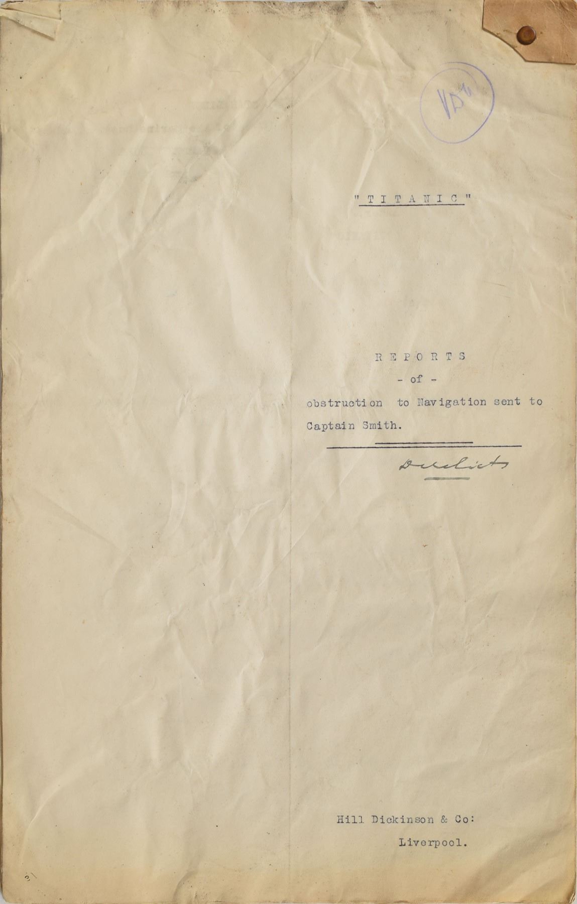 Packet of typescript "Reports of obstruction to Navigation sent to Captain Smith," compiled by the White Star Line's law firm Hill Dickinson & Co. of Liverpool following the Titanic disaster, seven pages, 8.25 x 13.25, plus one page headed "Extract from Instructions given to Commanders in the Canadian Service respecting Field Ice." The documents record memos sent to Captain Smith between March 9 and April 10, 1912, detailing the latitude and longitude of wreckage observed by other vessels; these documents make no mention of icebergs, but record a variety of obstacles deemed detrimental to the safe passage of the Titanic.