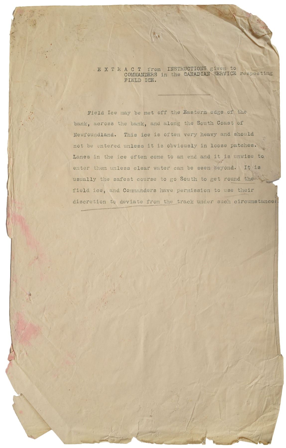The final report, dated April 10—the day Titanic departed on its maiden voyage—notes three sunken wrecks, in part: “’Galway, April 8, French steamer ‘La Touraine,’ from New York, reports by wireless that in lat. 40.56 long. 66.18 she passed a broken mast emerging vertically, very dangerous.’” The extract concerning field ice reads, in full: "Field Ice may be met off the Eastern edge of the bank, across the bank, and along the South Coast of Newfoundland. This is often very heavy and should not be entered unless it is obviously in loose patches. Lanes in the ice often come to an end and it is unwise to enter them unless clear water can be seen beyond. It is usually the safest course to go South to get round the field ice, and Commanders have permission to use their discretion to deviate from the track under such circumstances." In very good condition, with heavy overall wrinkling, creasing, and dampstaining.