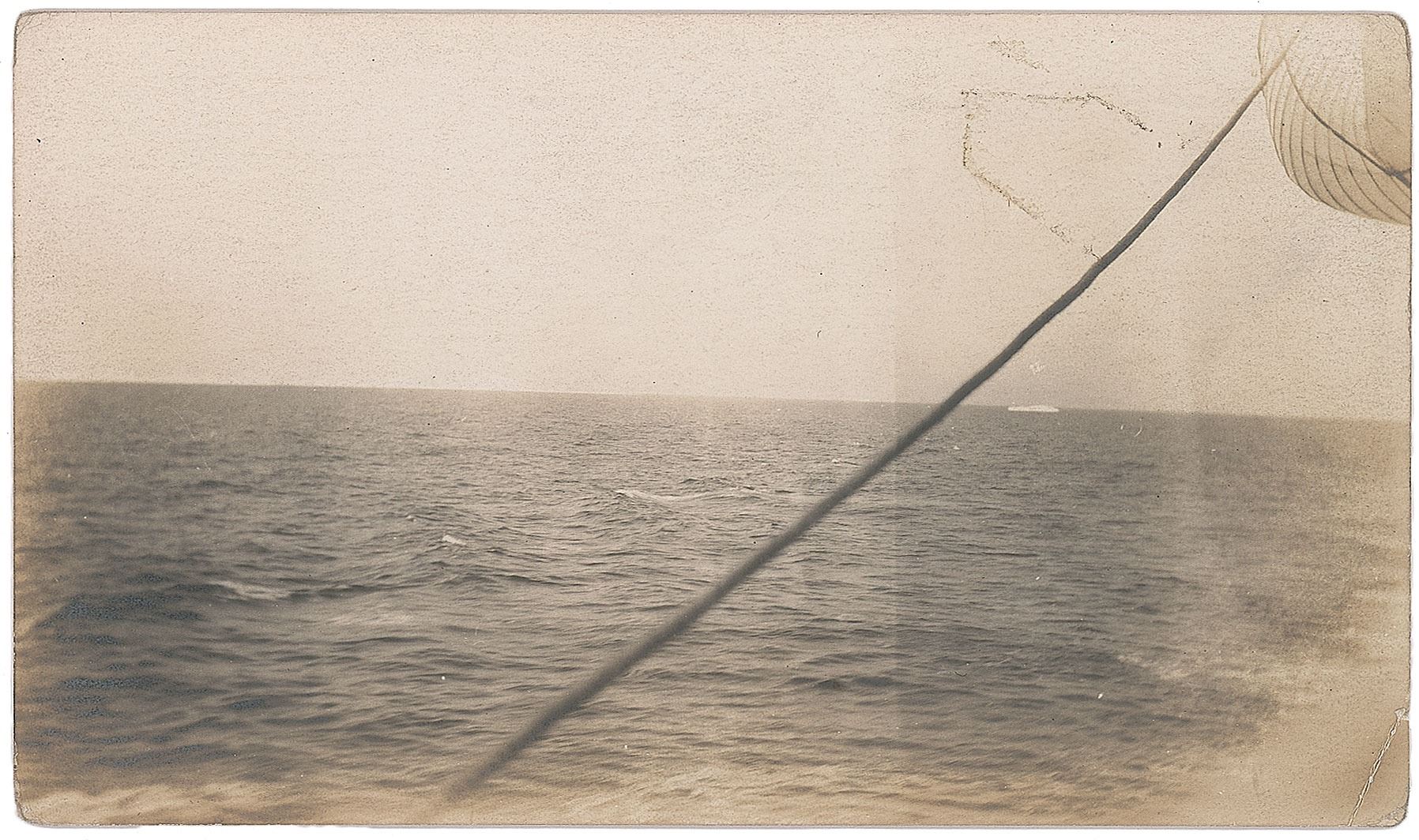 Original first generation matte-finish 5.25 x 3 photo of the Titanic wreck site, taken aboard the Carpathia on the morning of April 15, 1912. The photograph shows the frozen north Atlantic, with an iceberg off in the distance, and visible in the upper right corner, the hull of a lifeboat with a hauling rope passing diagonally through the image. Given the position of the rope, this lifeboat likely belonged to the Titanic, as the Carpathia delivered the Titanic’s lifeboats to New York. The photo was taken by Mabel Fenwick, a newlywed passenger on the Carpathia who took numerous photographs that day. The reverse bears a later ballpoint notation, "Titanic rescue." In very good to fine condition, with a crease to the lower right corner tip, and a bit of old adhesive residue to the surface.