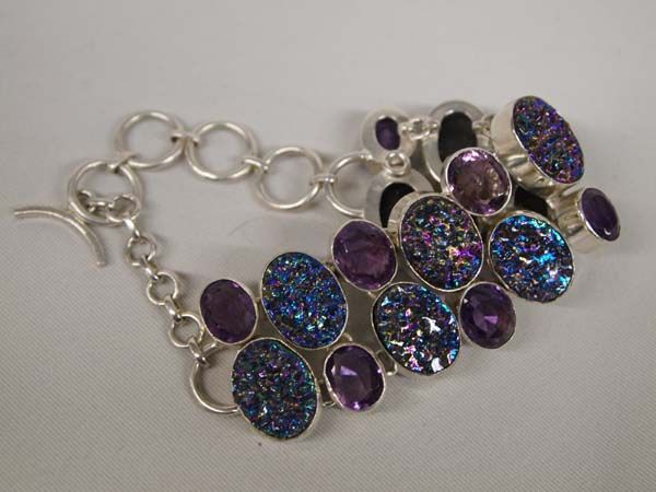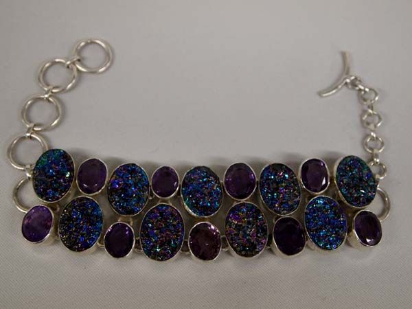 Titanium Peacock and Amethyst Druzy Bracelet. Set on sterling, this adjustable bracelet is 8.25''L x 1-1/8''W. It has a toggle clasp and is truly gorgeous!