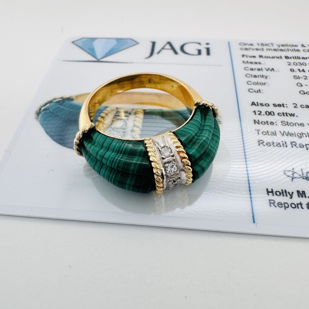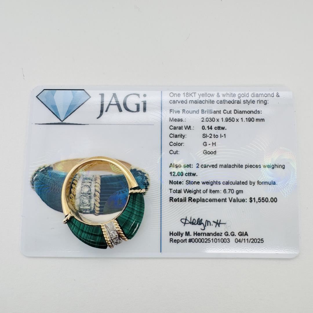 This 18K yellow and white gold diamond and carved malachite cathedral style ring features five round brilliant cut diamonds measuring 2.030 x 1.950 x 1.190 mm, weighing 0.14 cttw, with SI-2 to I-1 clarity and G-H color, exhibiting a Good cut. Also set are two carved malachite pieces weighing 12.00 cttw. The total item weight is 6.70 gm.
