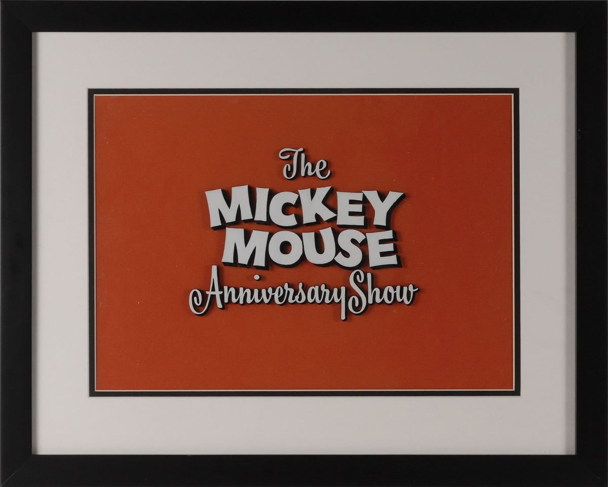 (Walt Disney Studios, 1968) Original title card production cel from The Mickey Mouse Anniversary Show, featuring black-and-white lettering. Image measures 8.5 x 6.5, with a mat opening of 15.5 x 11. This piece is also framed to an overall size of 22.5 x 18. In fine condition.