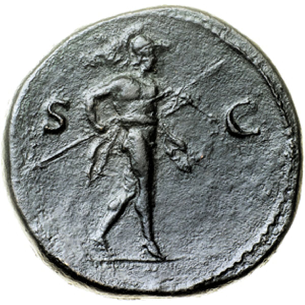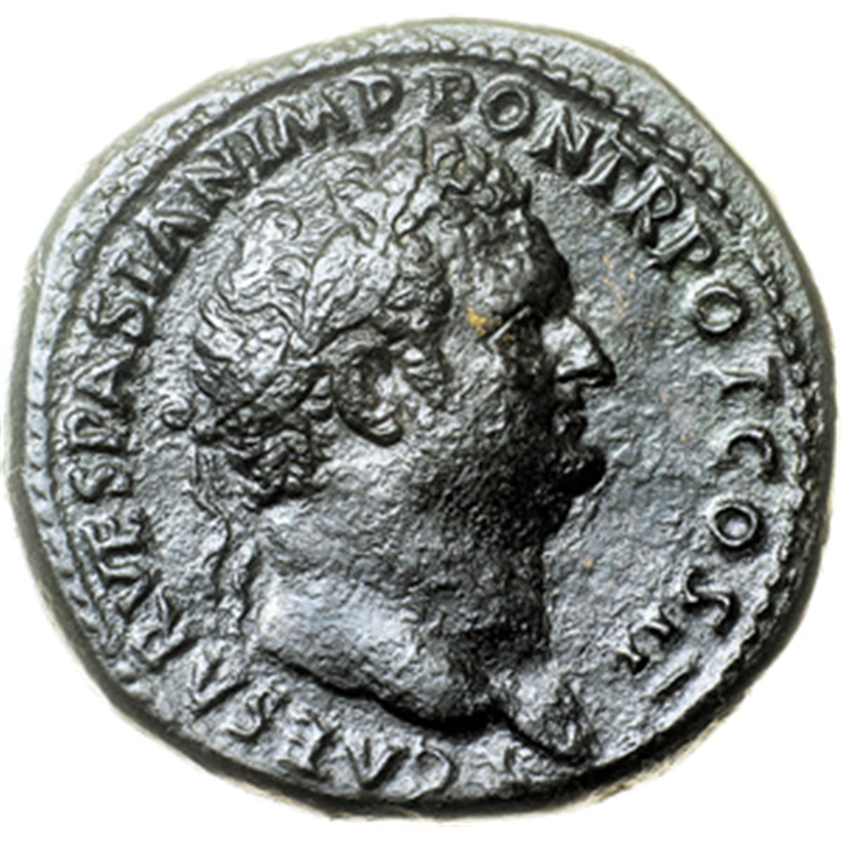 Impero Romano. Tito (79-81). Sesterzio. D/ T CAESAR VESPASIAN IMP PON TR POT COS II. Testa laureata a destra. R/ SC. Marte avanza a destra tenendo lancia e trofeo. RIC-.(cfr. 611 e nota). AE. g. 26.42 R. Bel BB+/qSPL. Variante rara.
