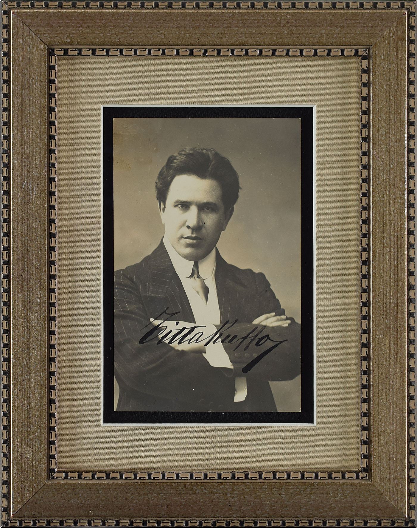 Vintage matte-finish 3.5 x 5.5 postcard photo of the great baritone with his arms crossed, boldly signed in ink. Mounted, matted, and framed to an overall size of 7.75 x 9.75. In fine condition.