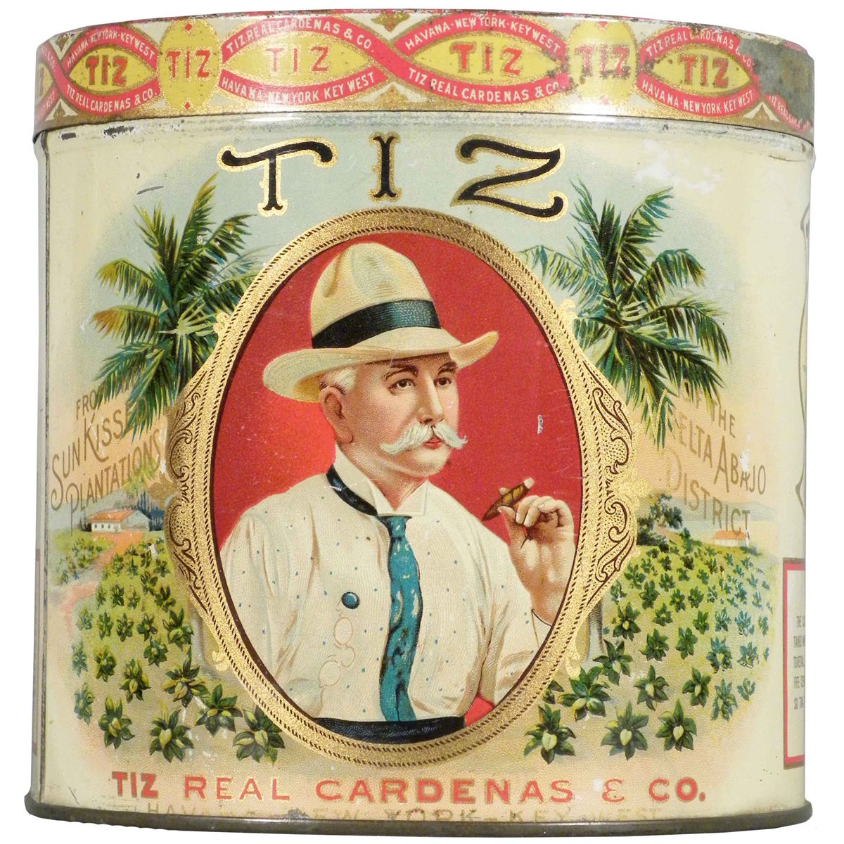 Tiz 5 Cent Havana Segars Tin for 50 Cigars. Tiz Real Cardenas & Co. Havana-New York-Key West. Liberty Can Co. Light scratches and edge ware otherwise very good condition. 5 1/2 inches tall X 5 3/8 inch diameter.