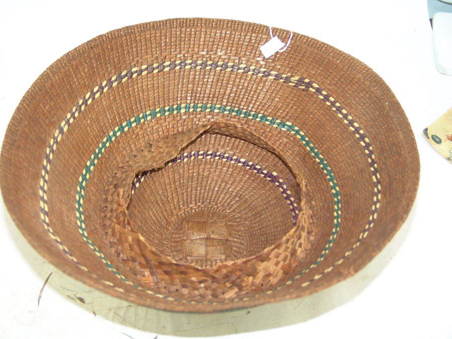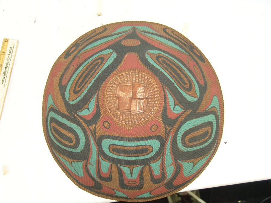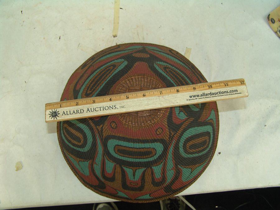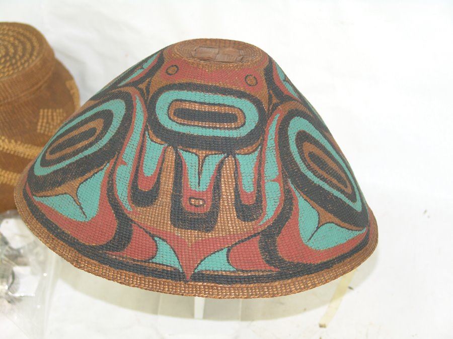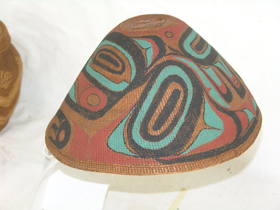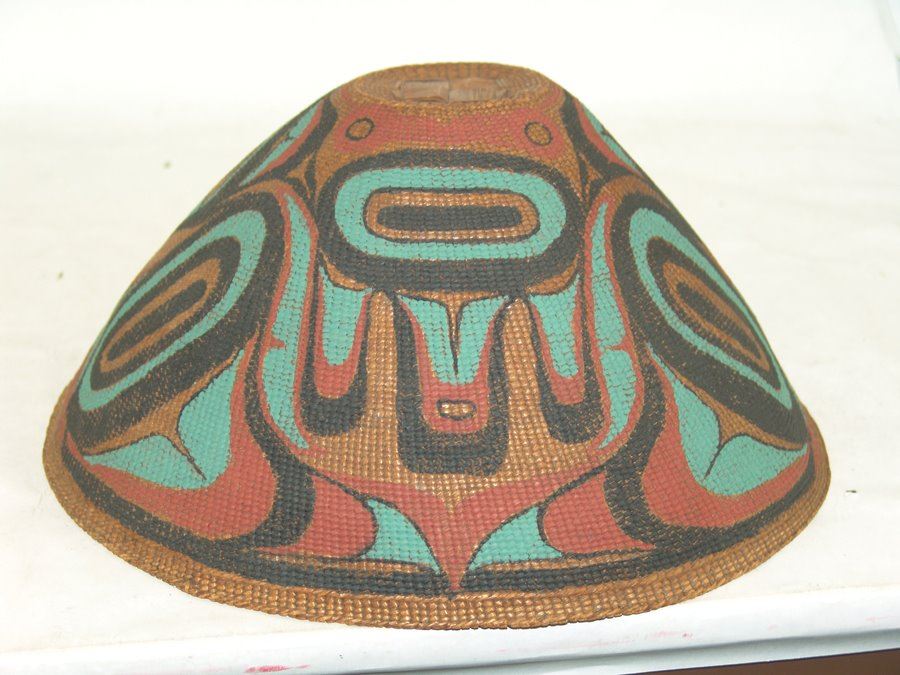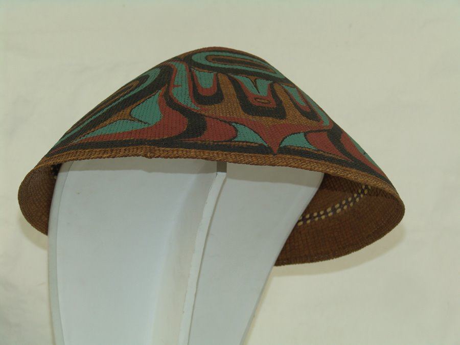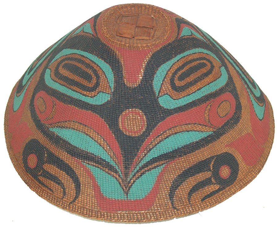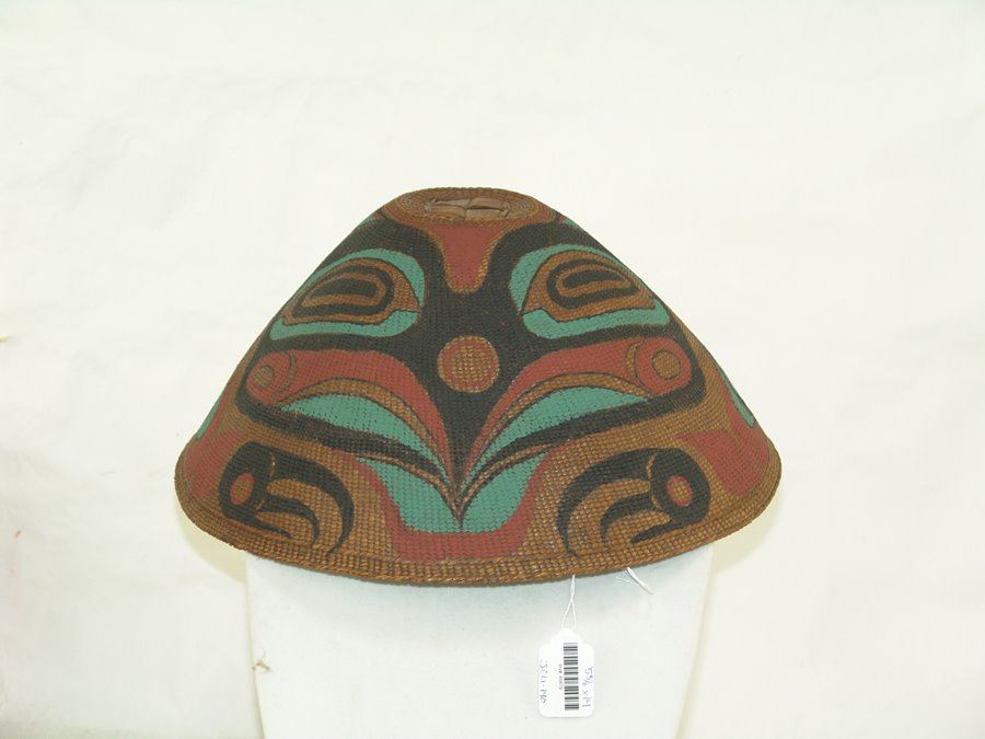 Exceptional traditional woven cedar bark rain hat with interior brim and painted exterior featuring a stylized eagle figure with beak and talons visible. Very good condition, a museum quality example.,Mid/Late 1900s,5-5/8" x 14"