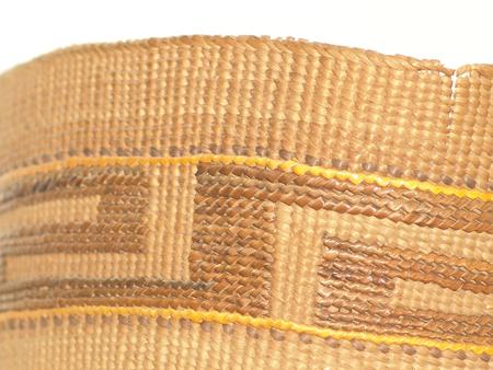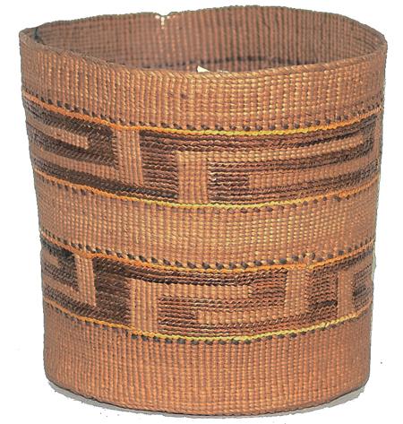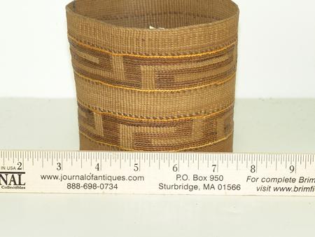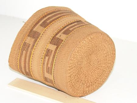 Circa 1920, Very fine weave small cylinder basket with imbricated exterior key designs. Very good condition, one minor repair. 4-1/2" x 5" From the Johnson Collection.