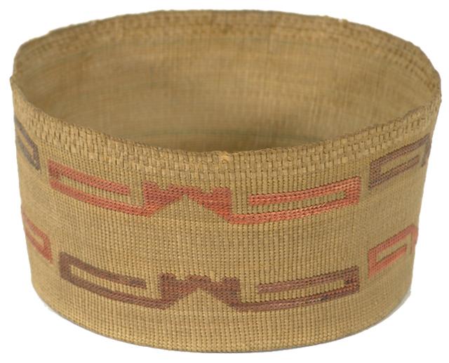Late 1800s, Very fine straight-sided woven basket with beautiful orange and brick-colored designs; very good condition. 3-3/4" x 7-1/4"