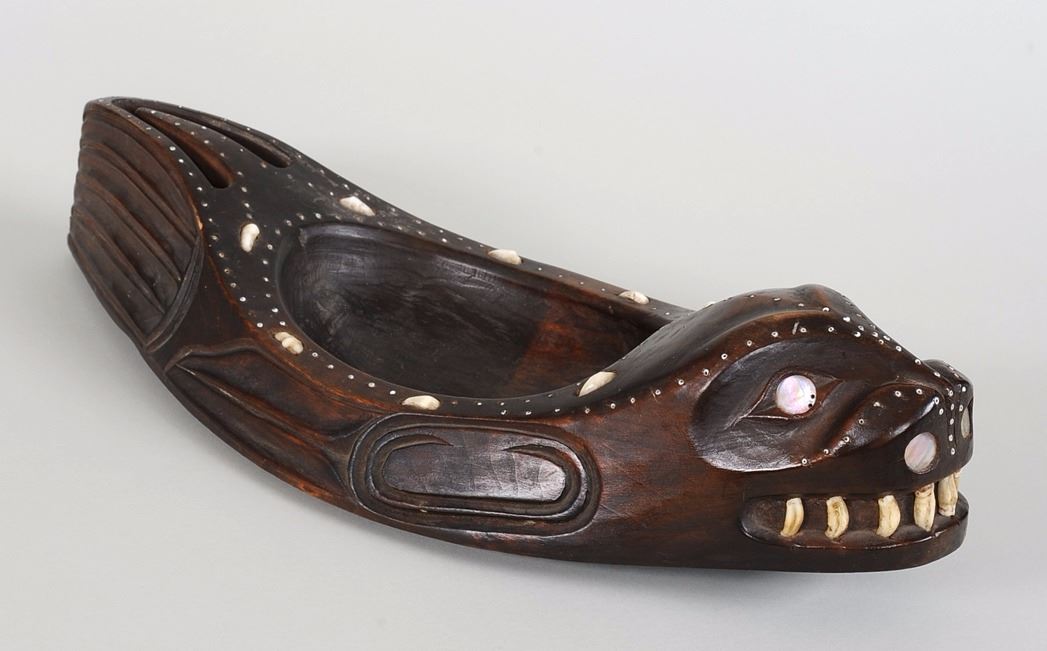 Tlingit Carved Bowl with Inlaid Beads, Abalone and Operculum ca. 1900 Ex: Rassmussen Collection 16 1/2" L. 6 1/2" W. Good Condition