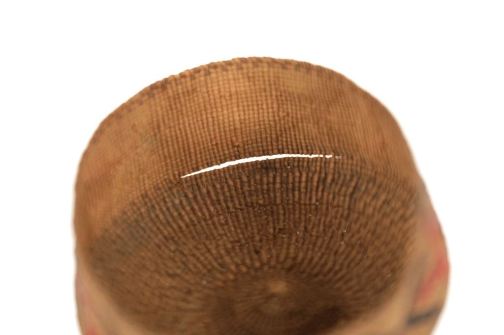 Featured in this lot is this hand woven polychrome basket from Tlingit Chilkat Tribal weavers circa 1930's. The basket features a wonderfully and professionally crafted spruce root and bear grass construction that shows a beautifully decorated polychrome design of geometric patterns along the side walling of the basket. The condition of this basket is fair with a single fissure in the weave close to the base of the basket but otherwise shows fair overall condition. The measurements of this basket is 2" x 5 1/4" x 4".