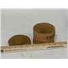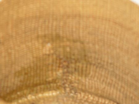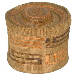 Ca. 1900, Fine weave cylinder basket with traditional top, the handle a rattle filled with seeds, and with beautiful orange and brown key-type imbricated design. Good condition, some small repairs. 3-3/4" x 4"