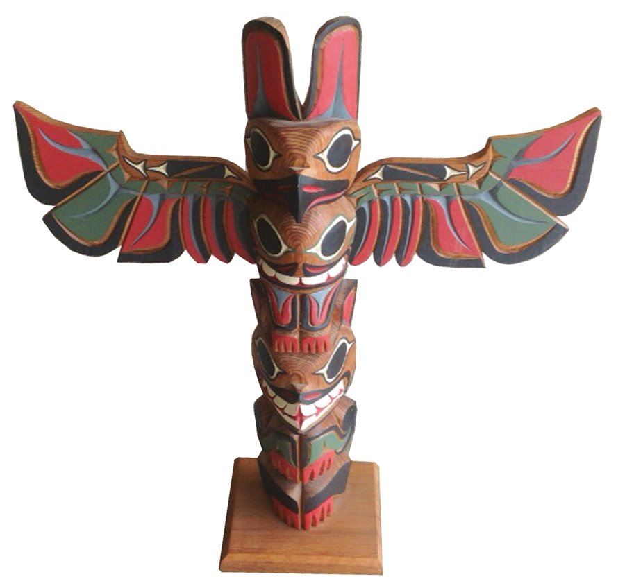Beautiful deep relief carved three-figure red cedar totem pole with eagle, bear, and beaver figures, the eagle with (removable,) outstretched wings. Very good condition.,,19" x 18" x 3"