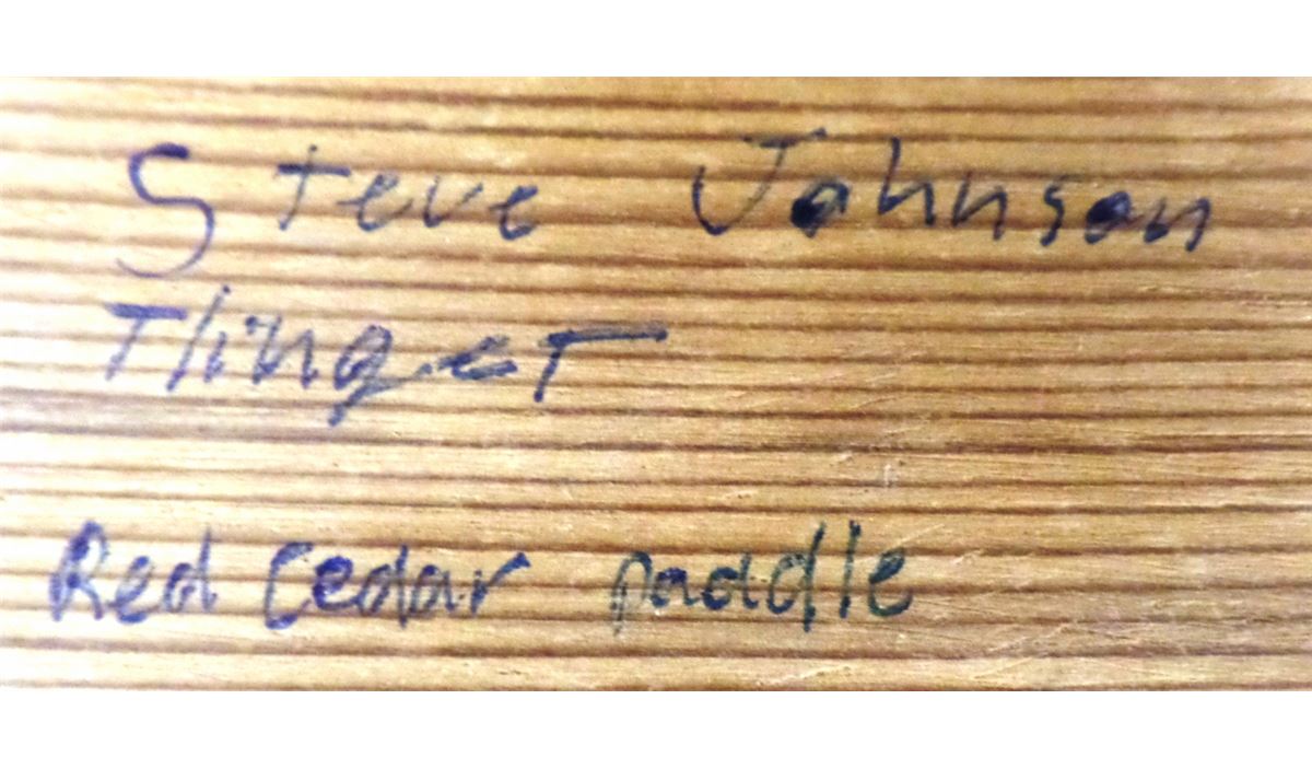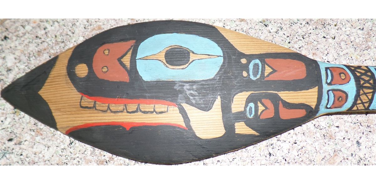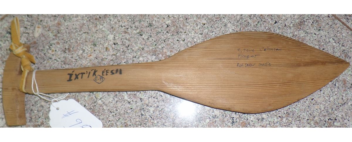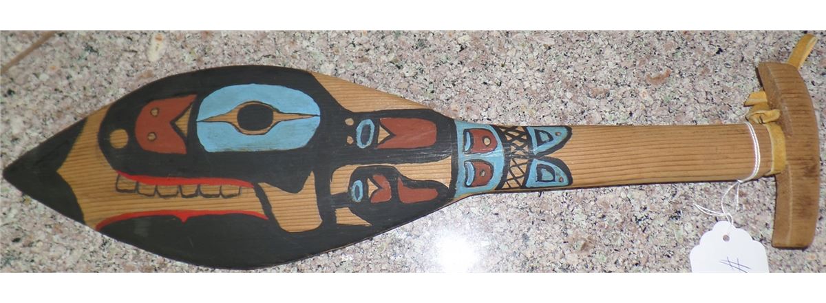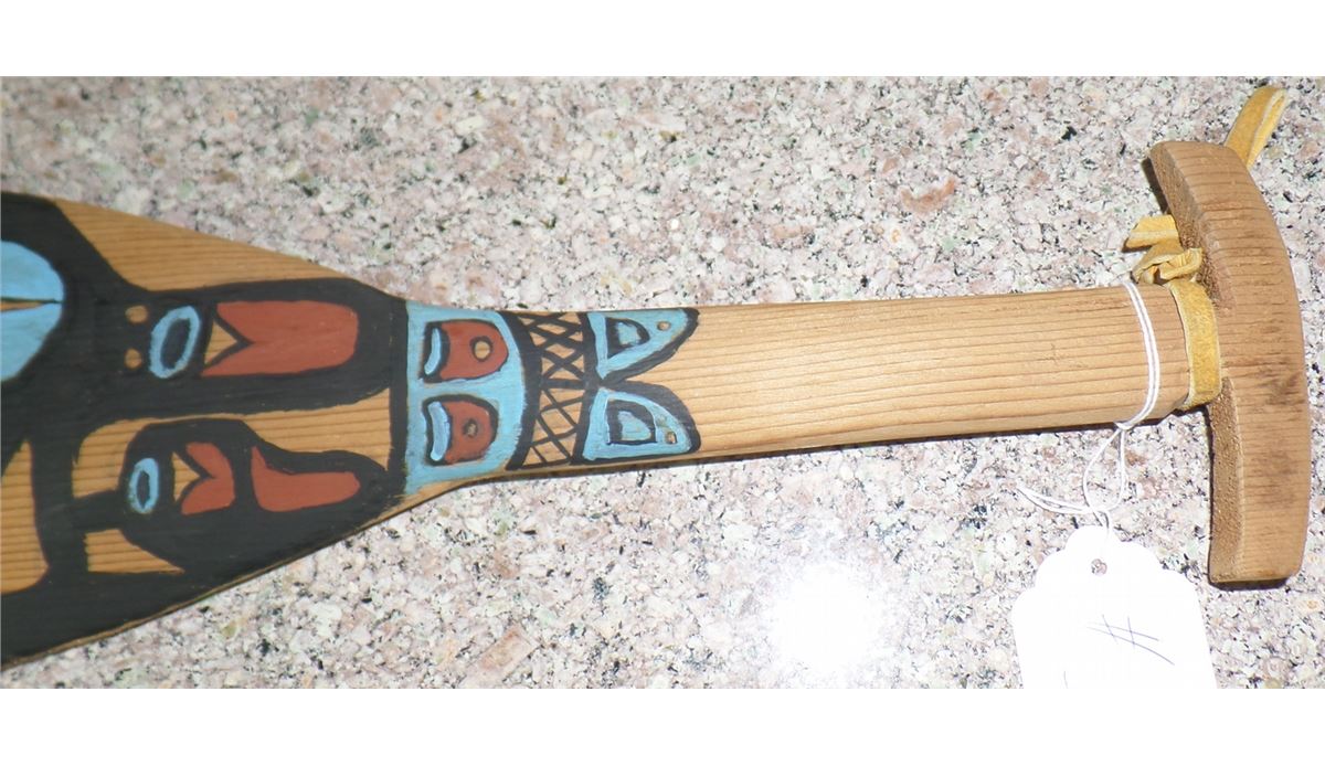 This red cedar and paint American Indian Paddle is possibly Tlingit. The red cedar and paint NWC paddle is dated 1999 and measures 18 1/2 x 4 1/2 x 1" and shows minor wear. It is in nice condition. Shipping $20.00