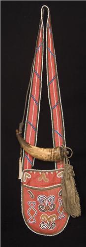 Tlinglet Indian Beaded Bandoleer Bag. Bag is 8" x 9 ½”. 32” long. Typical 19th Century designs. Together with fine old powder horn, measure and leather bullet bag. Strap restored. Otherwise fine condition. (est $3,000-4,000)