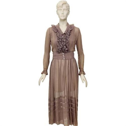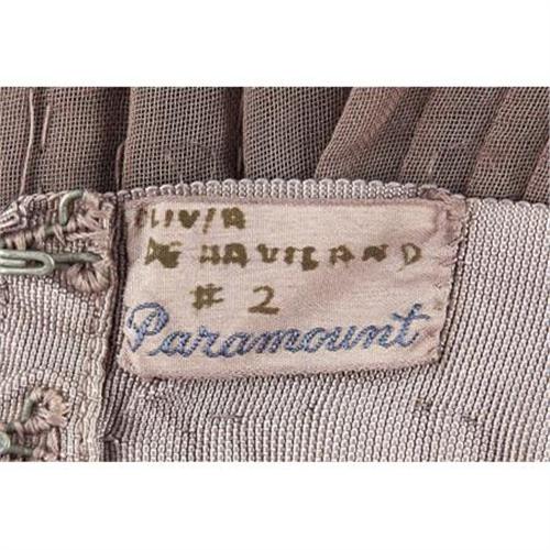 <B>Olivia de Havilland</B></I> <B><I>To Each His Own</B></I></B></I> <B>Screen-Worn Dress.</B></I> Winning an Oscar for Best Actress in her leading role as Miss Josephine Norris in <I>To Each His Own,</B></I> Olivia de Havilland put forth perhaps the most moving performance of her career. This dress from <I>To Each His Own</B></I> was screen-worn by de Havilland in the film and has a Paramount tag attached to the inner waistline with her name written in brown ink. To top it off, the piece was created by renowned costume designer Edith Head. What a combination -- an Oscar-winning performance and Edith Head original! The delicate brown dress is accentuated with intricate ruffles along the front and horizontal pleats along the base. Accompanied by an image of de Havilland wearing the dress in the film. In Excellent condition.<BR><BR><b>Shipping:</b> Clothing, Costumes & Jerseys (<a target="_blank" href="http://www.heritageauctions.com/common/shipping.php">view shipping information</a>)