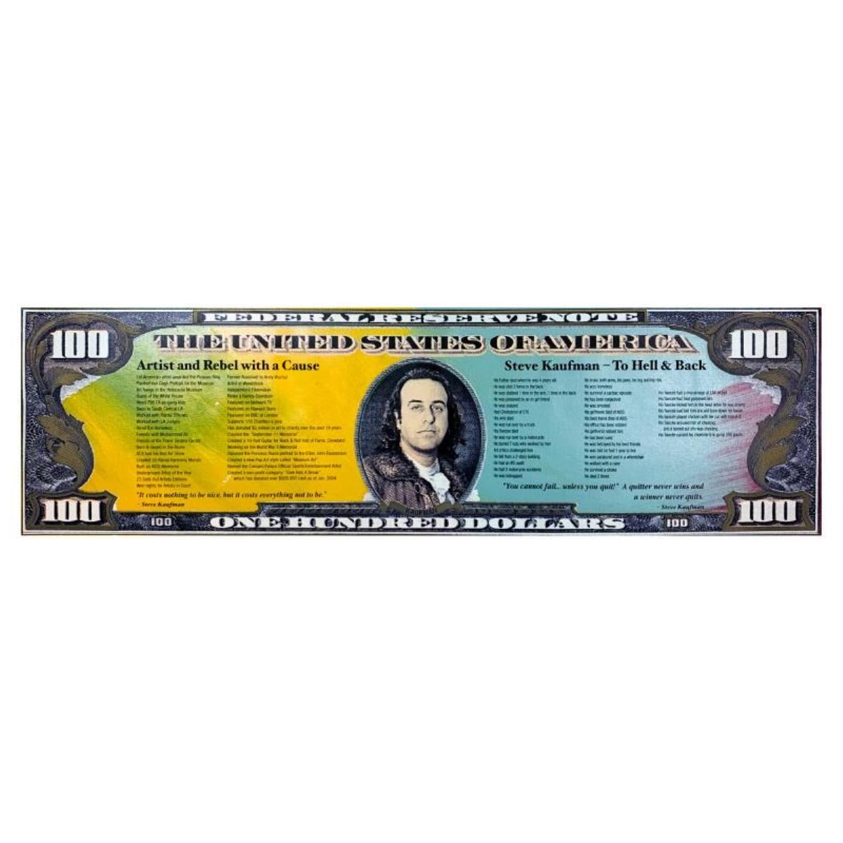 To Hell and Back ($100) by Steve Kaufman (1960-2010). "$100 To Hell and Back" is a limited edition hand pulled silkscreen unique mixed media on canvas by Andy Warhol protege Steve Kaufman (1960-2010). This piece is numbered and hand signed inverso and includes a letter of authenticity. As is common with Kaufman's works, this piece may have perceived minor flaws, but is in overall good condition. Measures approximately 15" x 47" before cropping.