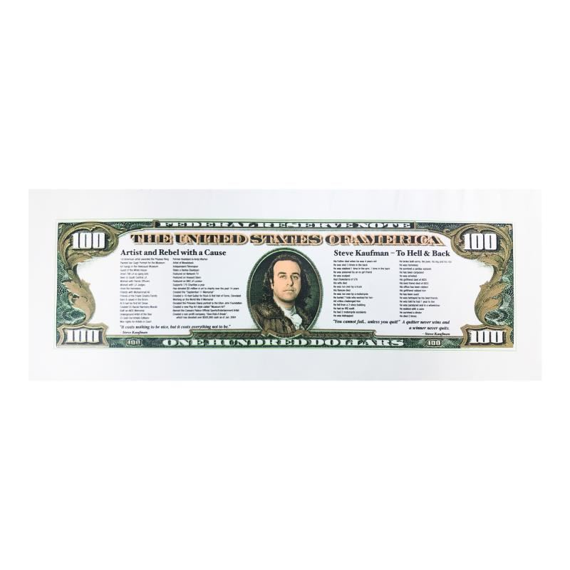 "Steve Kaufman 100 Dollar Bill (To Hell and Back)" is limited edition hand pulled silkscreen unique mixed media on canvas by Andy Warhol protege Steve Kaufman (1960-2010). This piece is numbered and hand signed inverso and includes a letter of authenticity. As is common with Kaufman's works, this piece may have perceived minor flaws, but is in overall good condition. Measures approximately 17" x 46" before cropping.