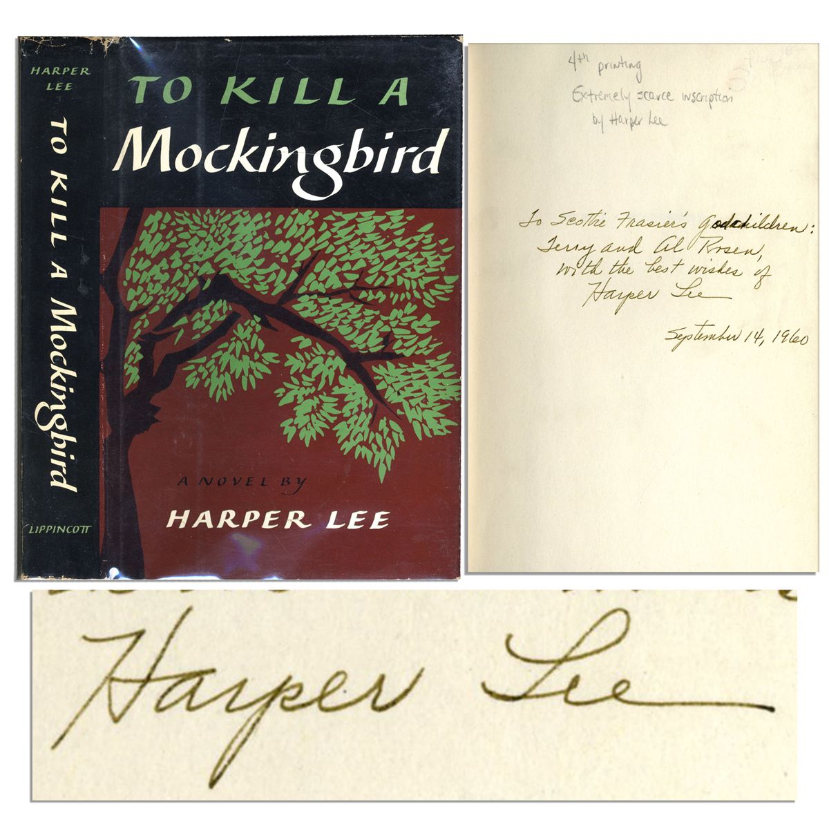 Scarce early Harper Lee signature on a first edition, fourth printing of her classic, ''To Kill a Mockingbird'' published by J.B. Lippincott Company: Philadelphia: 1960. The elusive Pulitzer Prize winning author pens a rare inscription on the front free endpaper the year of the book's release: ''To Scottie Frasier's Godchildren: Terry and Al Rosen, With the best wishes of Harper Lee / September 14, 1960.'' Harper Lee's portrayal of life in a small Alabama town captured the essence of the South and became an instant American classic. She never finished a second novel and granted almost no interviews or public appearances. Volume runs 296pp. and measures 5.5'' x 8.25''. Later eighth printing dustjacket encases the book. Some light wear to edges of dustjacket, else near fine condition.