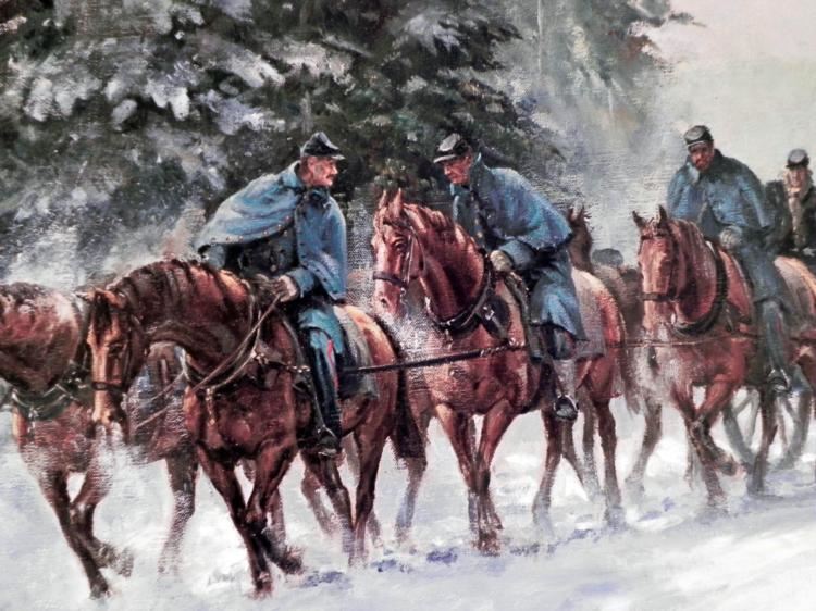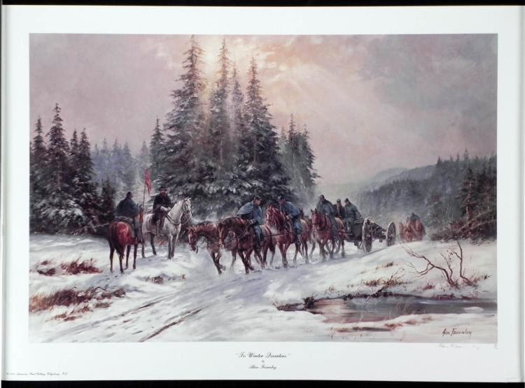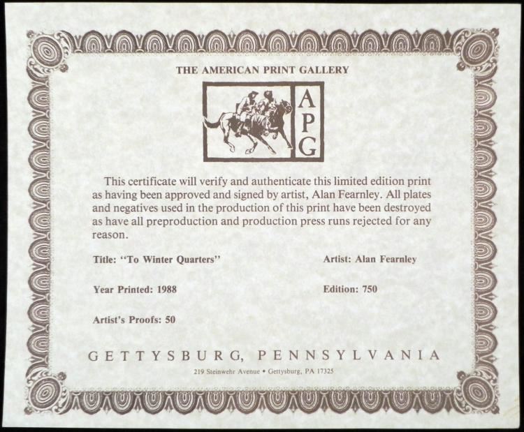 To Winter Quarters Alan Fearnley Civil War Print Art Title: "To Winter Quarters"Artist: Alan FearnleyArtists Proofs: 50 Published by the American Print Gallery, Gettysburg PAYear Printed: 1988 Sheet size: 20 × 28 Signed by the artist in pencil LR Numbered LTD Edition: 89/750 Condition: Very good; some creases on corners Original Certificate of Authenticity