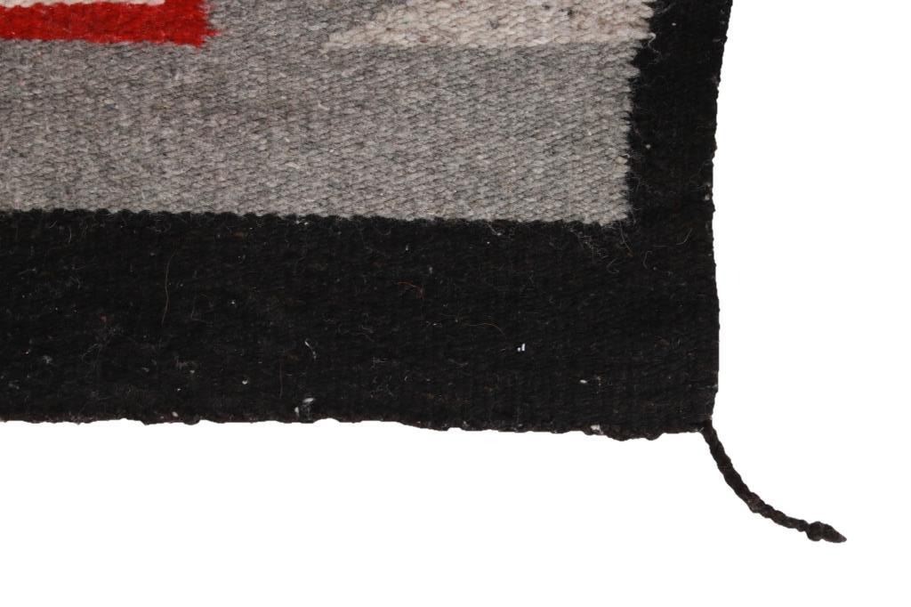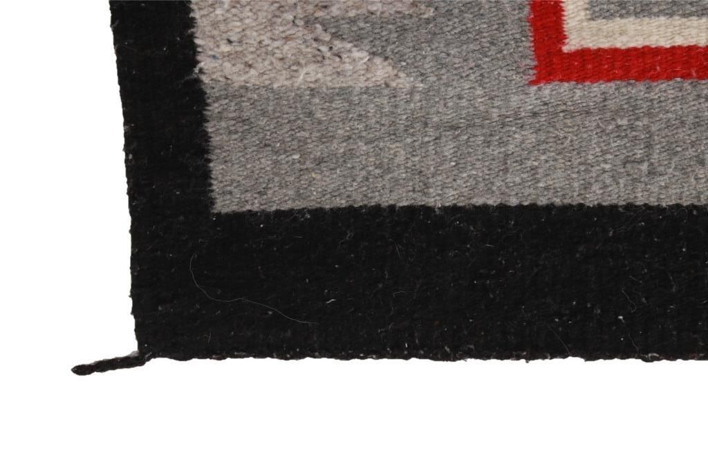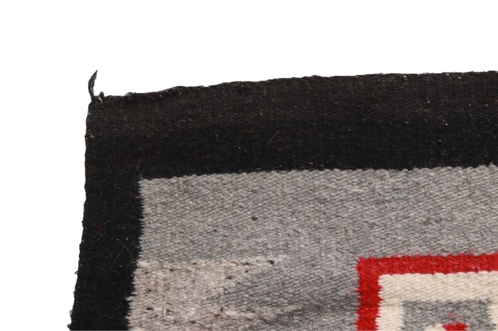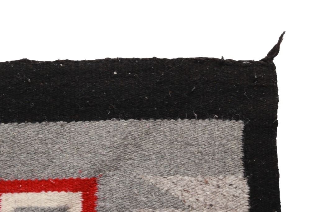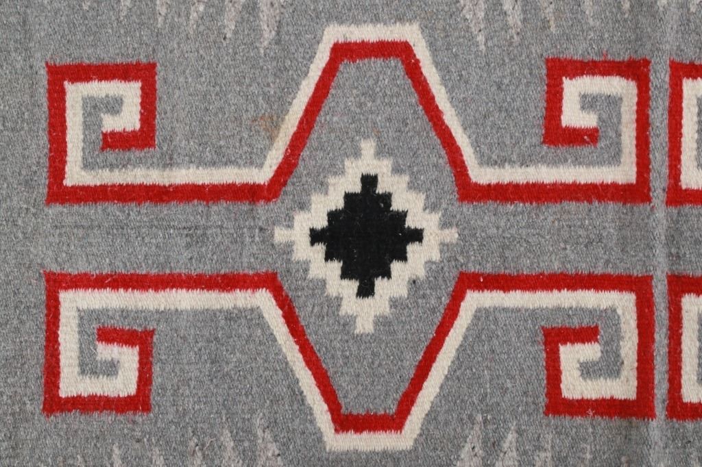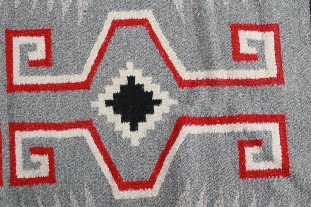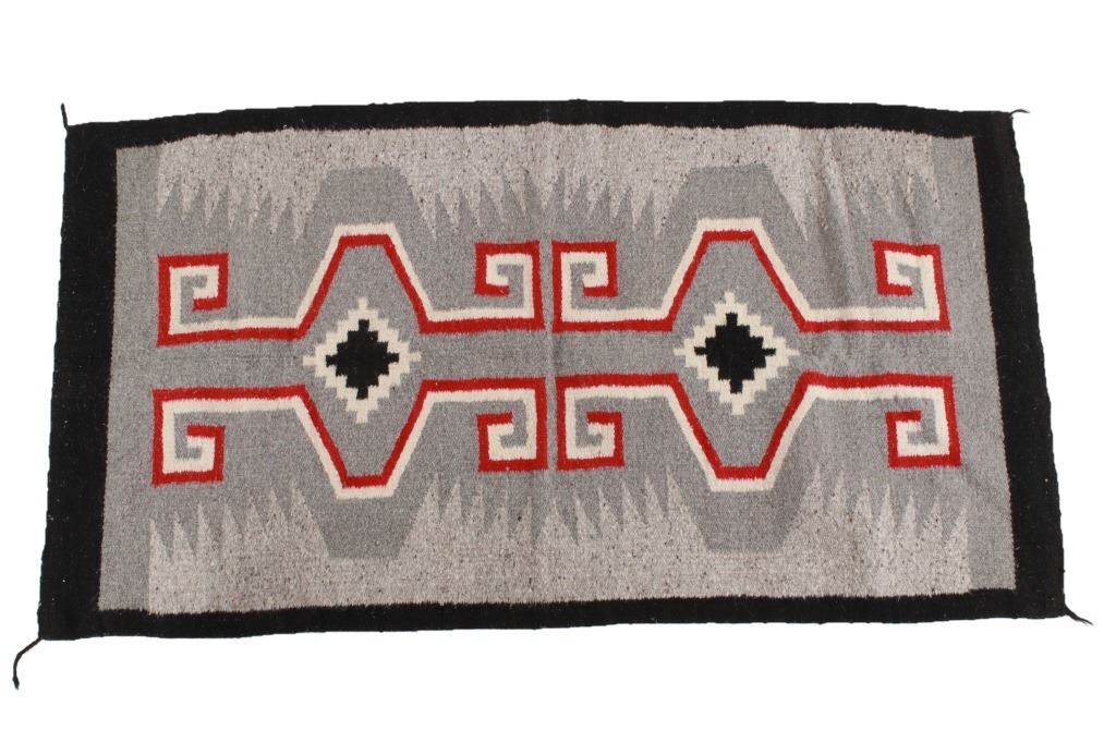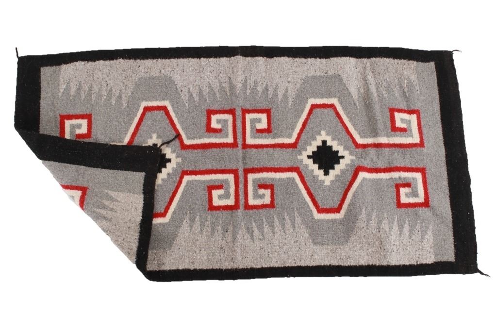 The lot features a nice, hand woven rug / blanket showing a classic geometric “Toadlena / Two Grey Hills” pattern or style done by a Mexican weaver from the late-1900’s. The rug shows a soft wool / cotton hand woven rug with bold geometric pattern showing a black border with grey background having a stepped outer border with red / and white hooked diamond like patterns with stepped diamonds at center. Previously said to have been purchased from a weaver in Oaxaca, Mexico in the late-20th century. This rug is in good overall condition, the weave is tight, tasseled at each corner, one corner has minimal damage at the tassel. No other obvious damage noted. Measures 55"L x 28"W.