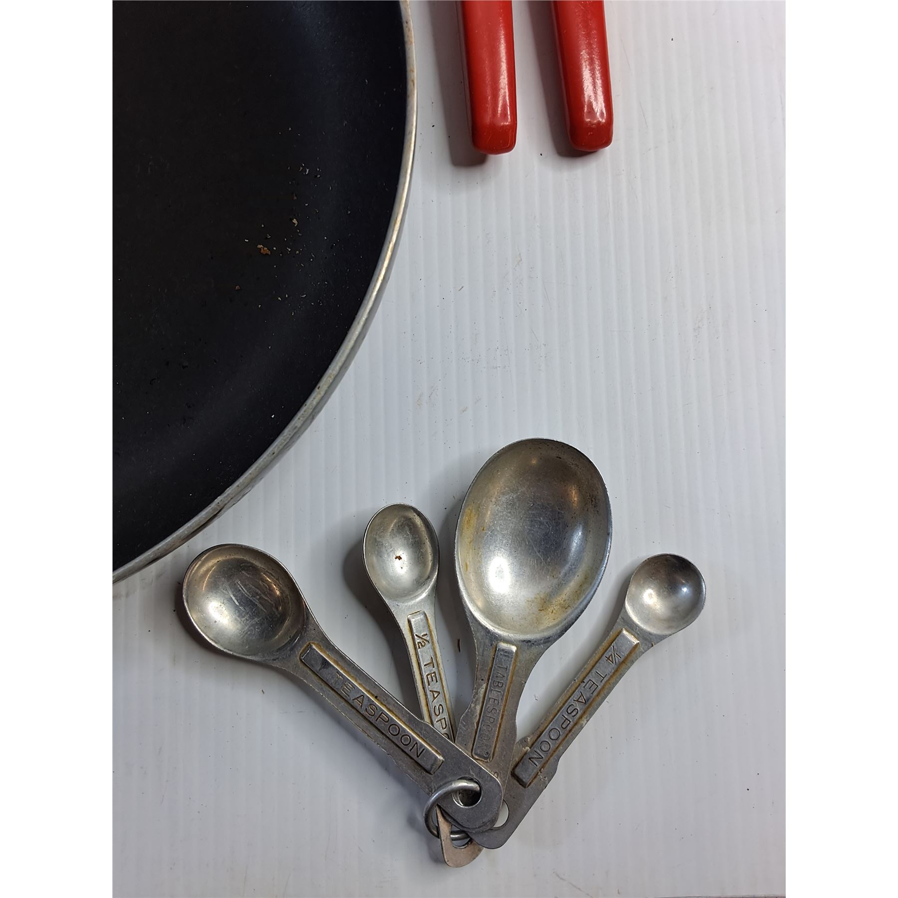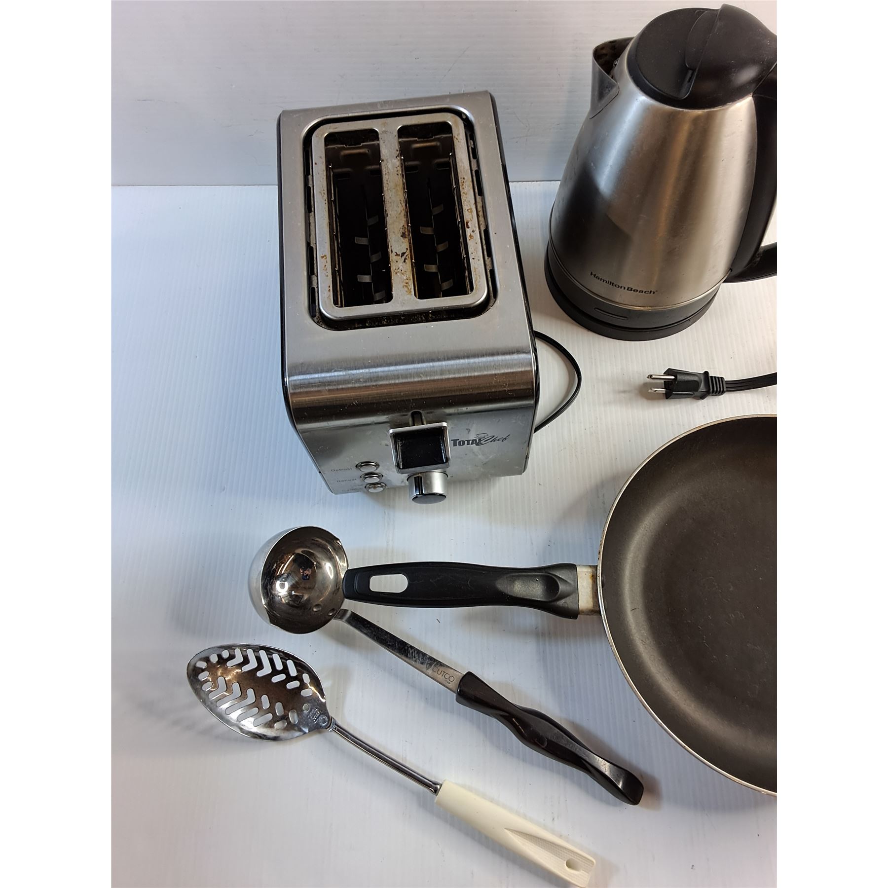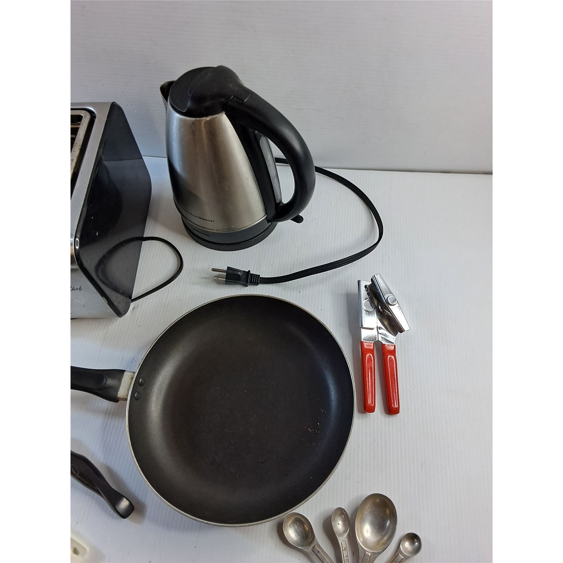 Toaster, Hamilton Beach Kettle, Ladel, Can Opener, Frying Pan, Measuring Spoons and Slater Spoon