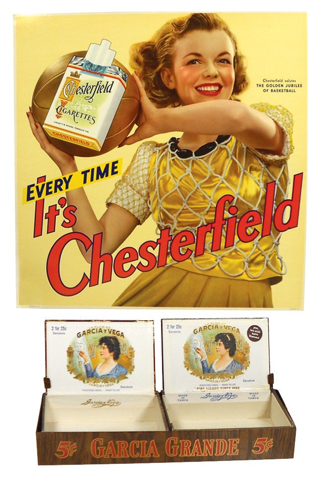 Tobacciana (2), Garcia Grande Cigar boxes in metal counter display w/orig box & Chesterfield cdbd litho mfgd by Liggett & Myers Tobacco Co., box water stained & torn o/wise Exc cond, cigar display 7.5"H x 17.25"W x 5.75"D; cdbd litho 22"H x 21"W.