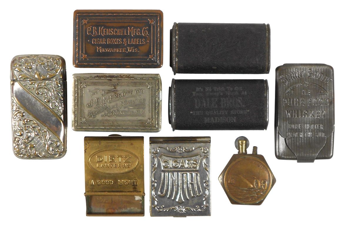 Tobacciana advertising smalls (9), match safes & lighter, C.B. Henschel Cigar Boxes & Labels-Milw, S