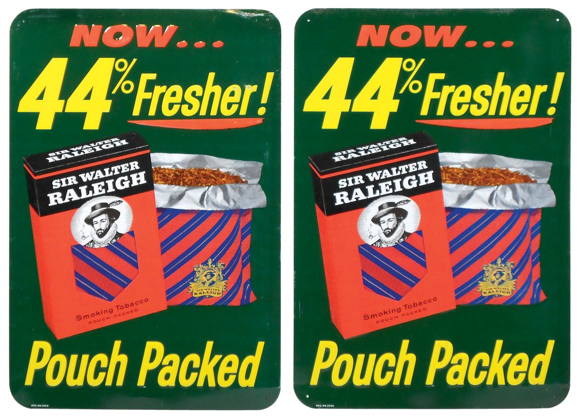 Tobacciana signs (2), Sir Walter Raleigh embossed metal signs, colorful tobacco pouch graphics, both VG/Exc cond, 24"H x 16.5"W.