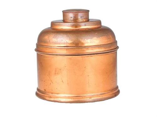 Copper, tinned inside. On the cover there is an adjustable air-hole. Marked inside the cover: Rumidor Corporation, New York City, on the bottom: Dunhill London. Size: 14.5 cm