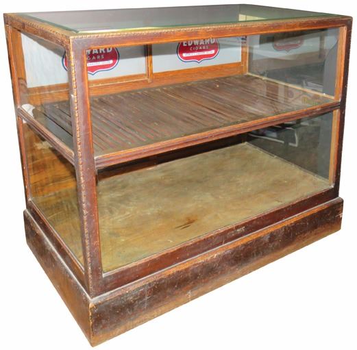 Tobacco Store Humidor Floor Display Case. King Edward Cigars decals on back door. Right panel glass broken otherwise good original condition. 47 X 42 X 25 inches.
