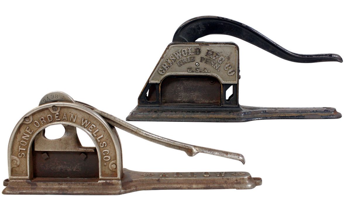 Tobacco cutters (2), Griswold Mfg. Co.-Erie, PA & Stone Ordean Wells Co. "Arrow", both Exc cond, 8"H