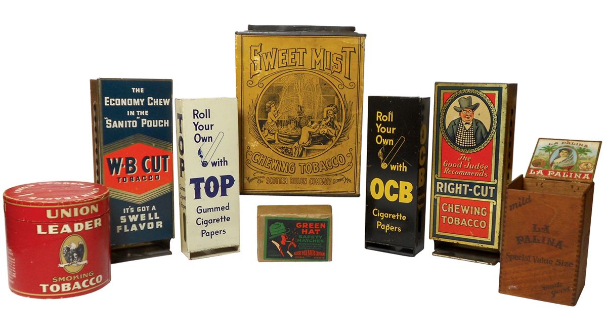 Tobacco items (8), W-B Cut, O.C.B., Top & Right-Cut dispensers, Sweet Mist cdbd box (large hole on back corner), wood La Palina Cigar box, Union Leader cdbd canister & Green Hat Matches, Exc NOS, all VG & Exc cond unless noted, up to 11"H.