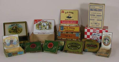 Tobacciana items including Benefactor Cigar box, Yankee Girl Scrap box, Old Hill Side Natural tobacco, Cinco Cigar box and more, 15 pieces total. Good Cond.