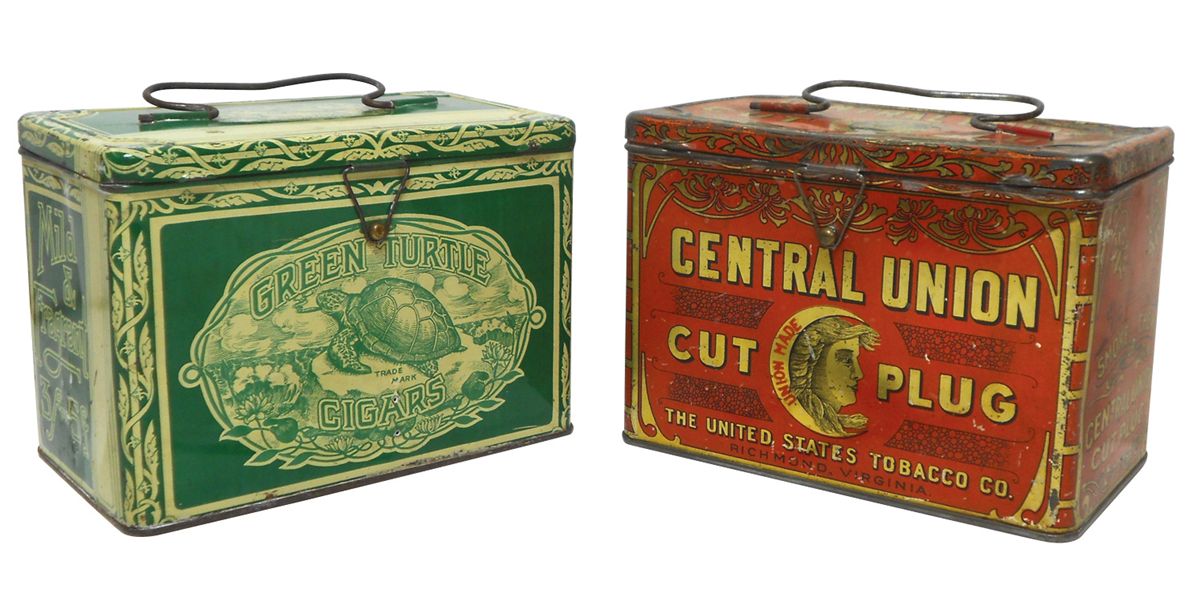 Tobacco lunch boxes (2), Green Turtle Cigars, VG/Exc cond & Central Union Cut Plag, VG cond, 5.5"H x 8"W.